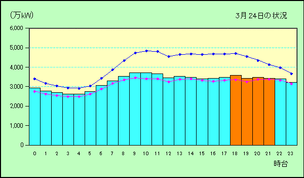 3/22から東京電力のホームページで見ることができるようになった、「電力の使用状況グラフ」ですが、CSVファイルでの公開もはじまったので、いろいろなところでデータを見ることができるようになりました。3/24の一日の変化は次のようでした。3/23は次のようなグラフでした。3/23より3/24は8時~9時で電力が増加しており、この分だと今日はまたまずいのでは…と思いながら朝からグラフを眺めていたのですが、10時以降それほど使用電力は増加しませんでした。結局、唯一の計画停電を実施した第1グループが開始する18:20までそれほど電力使用料が増加せずにほぼ予測値に近いカーブを描いています。東京電力はかなり予想が的確にできているようです。3/25については前日の段階から18:20~22:00の時間帯以外は計画停電を実施しないことが決定しています。 第3グループ 6:20~10:00 … 計画停電は実施いたしません。 第4グループ 9:20~13:00 … 計画停電は実施いたしません。 第5グループ 12:20~16:00 … 計画停電は実施いたしません。 第3グループ 13:50~17:30 … 計画停電は実施いたしません。 第1グループ 15:20~19:00 … 計画停電は実施いたしません。 第4グループ 16:50~20:30 … 計画停電は実施いたしません。 第2グループ 18:20~22:00 … 左記の時間帯における実施の要否につい ては、今後需給を見極め、開始時間の2時 間前までにお知らせいたします。3/24時点での需要予測は ○3月24日の需給予測 需要想定 3,850万kW(18時~19時) 供給力 3,850万kW ○3月25日の需給予測 需要想定 3,850万kW(18時~19時) 供給力 3,850万kW計画停電を実施しないと需要と供給がとんとんで、需要が予想を下回っていない限りは、第2グループの計画停電は実施することになりそうです。もう少し暖かくなるまで、しばらくは 18:20~22:00の時間帯だけ計画停電を実施することになるのかもしれません。