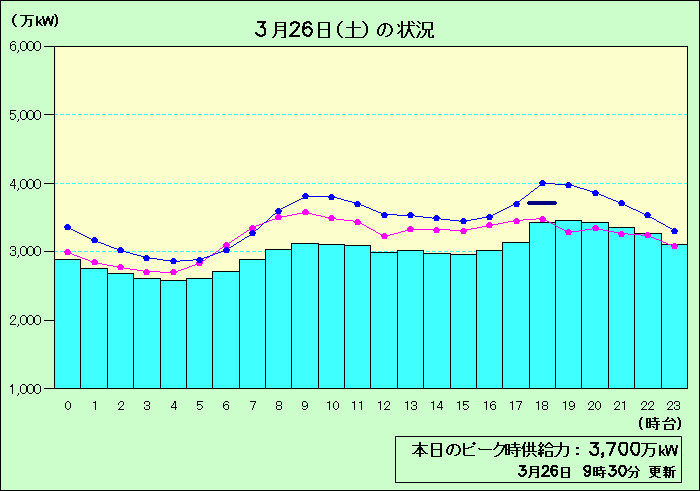3/26から計画停電のグループが細分化され、5グループ内がさらに5つに分割されていたのですが、3/26,27の土日は計画停電が実施されませんでした。3/28(月)からいよいよ細分化された中で計画停電が開始です。3/27時点で次のような内容で計画停電の実施について発表されています。 第1グループ 6:20~10:00…計画停電は実施いたしません。 第2グループ 9:20~13:00…A・B・Cの区分について計画停電を実施い たします。(D・Eの区分につきましては実 施いたしません) 第3グループ 12:20~16:00…計画停電は実施いたしません。 第1グループ 13:50~17:30…計画停電は実施いたしません。 第2グループ 16:50~20:30…計画停電は実施いたしません。 第4グループ 15:20~19:00 第5グループ 18:20~22:00 …左記の時間帯における実施の要否については、 今後需給を見極め、開始時間の2時間前まで にお知らせいたします。第4、第5グループについては開始時間の2時間前までに発表することになるようです。第2グループは朝の時間帯だけ、A,B,Cについて計画停電を実施します。ということは今度第2グループの計画停電が実施されるときはD,Eグループから優先的に実施されることになるのでしょう。休日の間は次のような電力需要だったようです。3/26からはピーク時の供給力が太い線で一緒に表示されるようになっています。どのくらい余裕があるのか少し見やすくなっています。計画停電の実施がないと18時から21時に需要の大きな山ができてしまうようなので、もう少し暖かくなって暖房需要が減らないとこの時間帯に計画停電が実施される可能性はかなり高そうです。--------------------3/25時点の予測 ○3月25日の需給予測 需要想定 3,800万kW(18時~19時) 供給力 3,750万kW ○3月26日の需給予測 需要想定 3,500万kW(18時~19時) 供給力 3,750万kW3/27時点の予測○3月27日の需給予測 需要想定 3,400万kW(18時~19時) 供給力 3,700万kW○3月28日の需給予測 需要想定 3,800万kW(18時~19時) 供給力 3,850万kW