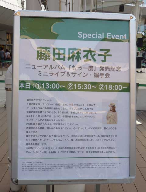 ラゾーナ川崎に立ち寄ったところ、ステージの周りに次のような看板がありました。藤田麻衣子さんが、アルバムリリースを記念してミニライブのようです。13:00~、15:30~、18:00~の3ステージの予定のようですが、18:30頃までは時間があいていたので、聴いていくことにしました。申し訳ないことに「藤田麻衣子」といわれてもまったく知らなかったのですが、愛知県出身のシンガーソングライターだそうです。藤田麻衣子wiki藤田麻衣子 オフィシャルサイト藤田麻衣子 公式ブログ2011年6月1日に新しいアルバム「もう一度」をリリースしたということで、ラゾーナ川崎のステージでミニライブ(無料)イベントが企画されました。6/11にはライブツアーのしめ(?)として渋谷C.C.Lemonホールでのライブがあるそうですが、その宣伝という意味合いもあったようです。ライブで披露したのは1 瞬間2 一つ言葉にすれば3 蛍4 もう一度の4曲見た目は小さめの女の子といった感じですが、しゃべりはどうどうとしていて、途中で観客に一緒に歌わせたり、一人でしきっています。途中緊張したのか、出だしがでてこなくなってあたふたしているお茶目なところもありましたが、歌はしっかりとしていて、楽しめました。アルバム購入者はライブ後にサイン会に参加できたのですが、自分は次の予定があったので、ライブ終了間際にその場を離れました。☆【送料無料】 CD/藤田麻衣子/もう一度(DVD付)(初回限定盤)/DLCK-11061価格:2,436円(税込、送料込)藤田麻衣子/さわって価格:2,289円(税込、送料別)藤田麻衣子/BEST ALBUM~緋色の欠片~(DVD付)価格:2,121円(税込、送料別)【送料無料選択可!】二人の彼 [通常盤] / 藤田麻衣子価格:2,429円(税込、送料別)藤田麻衣子 フジタマイコ / 会いたい 【CD】価格:2,268円(税込、送料別)