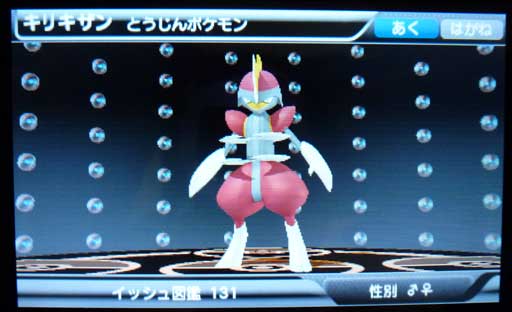 2011年08月25日 7時今日増えた2匹目のポケモンはキリキザン とうじんポケモンあく はがねイッシュ図鑑 131です。これで42匹目。