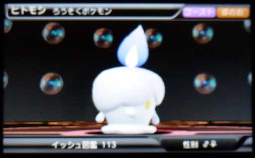 2011年08月21日 0:40 今日増えたポケモンは ヒトモシ ろうそくポケモンゴースト、ほのおイッシュ図鑑 113 です。 これで28匹目。