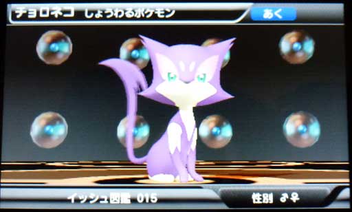 2011年08月19日 23:40今日増えた3匹目のポケモンはチョロネコ しょうわるポケモンあくイッシュ図鑑 015です。これで26匹目。
