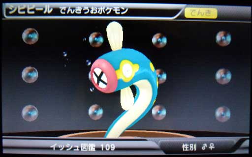 2011年08月24日 0時今日増えたポケモンはシビビール でんきおうポケモンでんきイッシュ図鑑 109です。これで37匹目。