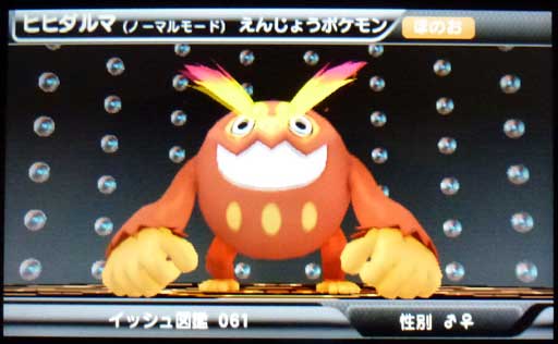 2011年08月19日 23時 今日2匹目の増えたポケモンは ヒヒダルマ(ノーマルモード) えんじょうポケモン ほのおイッシュ図鑑 061 です。 これで25匹目。