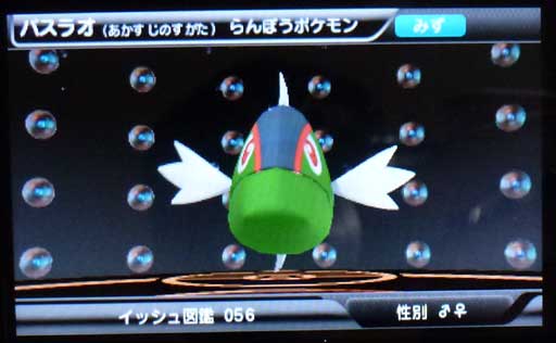 2011年08月30日 1:00今日増えたポケモンはバスラオ(あかすじのすがた) らんぼうポケモンみずイッシュ図鑑 056です。これで55匹目