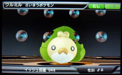 2011年08月27日 23時30分 今日増えた4匹目のポケモンは クルミル さいほうポケモンむし くさイッシュ図鑑 046 です。 これで49匹目。