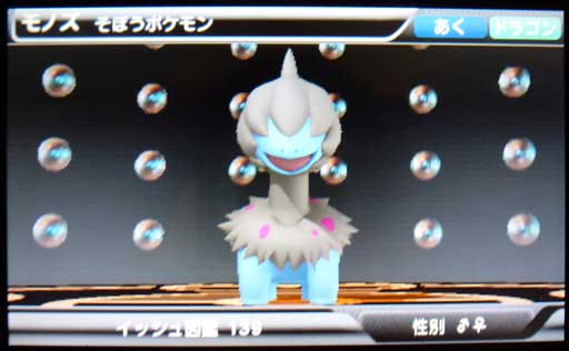 2011年08月27日 7時50分今日増えた3匹目のポケモンはモノズ そぼうポケモンあく ドラゴンイッシュ図鑑 139です。これで48匹目。