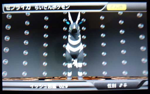 2011年08月27日 0時40分今日増えた2匹目のポケモンはセブライカ らいでんポケモンでんきイッシュ図鑑 029です。これで47匹目。