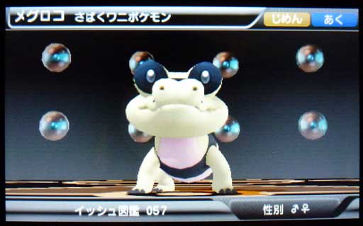 2011年08月23日 5時今日増えた3匹目のポケモンはメグロコ さばくワニポケモンじめん あくイッシュ図鑑 057です。これで36匹目。