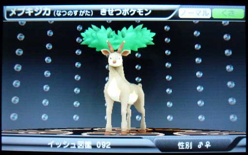 2011年08月23日 0時今日増えたポケモンはメブキジカ(なつのすがた) きせつポケモンノーマル くさイッシュ図鑑 092です。これで34匹目。