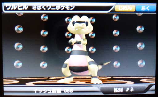 2011年10月1日 00:24今日増えた3匹目のポケモンはワルビル さばくワニポケモンじめん あくイッシュ図鑑 058です。 これで144匹目