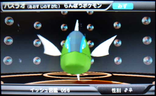 2011年09月28日 23:50今日増えた1匹目のポケモンはバスラオ(あおすじのすがた) らんぼうポケモンみずイッシュ図鑑 056です。 これで136匹目