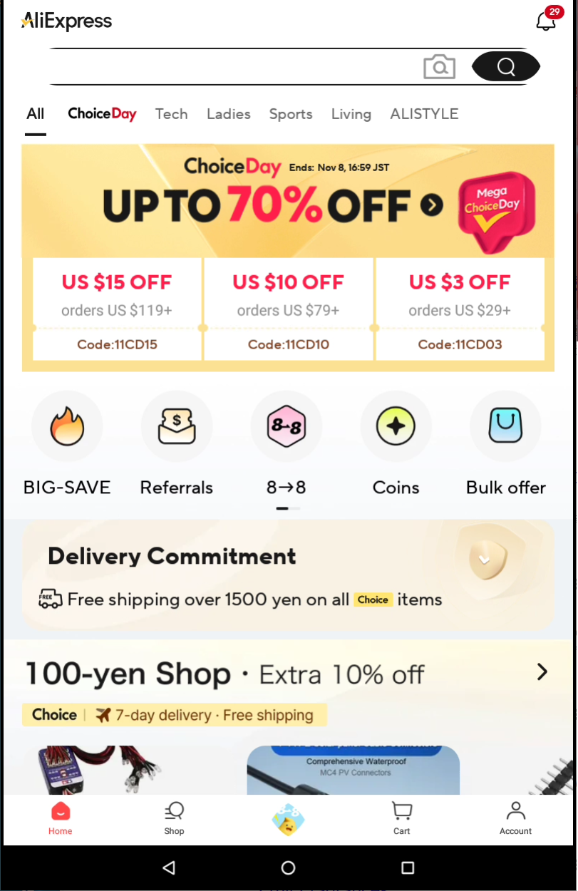 AliExpress(アリエクスプレス)が BLACK FRIDAYのセール中なので$100以上の高額商品を購入しようかと検討中です。ちなみにBLACK FRIDAYのセールは11/22 17:00~12/4 16:59 JST までのようです注文画面に Promo codes という欄があるけれど…ショップから送られてくるコードを使ったり、ブラウザが自動的に検出してくれるクーポンは使ったことがあるのですが、今回 BLACK FRIDAY用のクーポンがどうなっているのかよく調べていませんでした。調べたところ詳しいサイトがあったのでクーポンコードをまとめておきます(coupon-code-info.com)(クーポンと割引情報まとめ)☆AliExpressのBLACK FRIDAY(2024/11/22 17:00-12/4 16:59)で使えるクーポンコード(実際に $1,199以上の商品の購入画面で確認してみました)$19以上の買い物で使える$3の割引クーポン03BFAE :使えそうBFJP01$39以上の買い物で使える$6の割引クーポン06BFAE :使えそうBFJP02$89以上の買い物で使える$12の割引クーポン12BFAE :使えそうBFJP03$139以上の買い物で使える$20の割引クーポン20BFAE :使えそうBFJP04$209以上の買い物で使える$30の割引クーポン30BFAE :使えそうBFJP05$299以上の買い物で使える$45の割引クーポンBFJP08$399以上の買い物で使える$60の割引クーポン60BFAE :使えそうBFJP06$499以上の買い物で使える$80の割引クーポン80BFAE :使えそうBFJP07$799以上の買い物で使える$110の割引クーポン(ビジネスアカウント用)BBF110 : 使えない$1,199以上の買い物で使える$160の割引クーポン(ビジネスアカウント用)BBF160 : 使えない初めての購入用のクーポンのほかにビジネスアカウント用のクーポンがあることを初めて知りました。(商品によっては使えない場合もあるみたいですが)$499 以上で $80割引するクーポンまで使えそうです。複数購入すると価格が割り引かれる商品もあるのですが、分割してクーポンを使ったほうが安くなるのか?同じクーポンは2度使えないはずなので、$499以上の商品を複数購入したい場合は$499以上で購入→$80$399以上で購入→$60合計 $140 割り引かれるはず…クーポンの使い方で結構支払う金額がかわってきます。☆ゲームや商品閲覧でもらえる割引券AliExpressではアプリでゲームをしたり、商品ページを眺めることでポイント等をためて、割引券をもらうことができます。BLACK FRIDAY期間の今はつぎの3種類が実施中です。・Play &Earn10,000 pointで $1.00 のクーポン30,000 pointで $3.00 のクーポン50,000 pointで $5.00 のクーポンがもらえます頑張れば毎日 1700 point程度を獲得できるので 30日で 50,000 point獲得することが可能です。・MergeBoss Daily MissionsDaily Missionsで毎日最大 $400 ATM 貯められます。11/1~11/30 で約 $10000 ATM 貯められます。・MergeBoss Millionaire ChallengeMillionaire Challenge で 期間中に200,000 game dollar稼ぐと、約 $10000 ATM 貯められます(11/4-11/28)ゲーム内通貨の$10000 ATMが1 USドルになるので、それぞれ約 $1の割引券がもらえます。合計で $5 + $1 + $1 = $7 のクーポンになります。☆楽天リーベイツでもらえるポイントそういえば 楽天リーベイツ経由で aliexpressの商品を購入するとポイントバックされることも思い出しました。(AliExpress【海外ストア】のお得なキャンペーン)ここにもBlackFriday用クーポンコードが説明してありました。ポイントバック率は商品によって異なって・PC・携帯電話・タブレット機器・コンピューター周辺機・オーディオ・ビデオ機材:2.5%・衣類・アクセサリー・携帯アクセサリー・インテリア・ガーデニング雑貨:6.0%・その他カテゴリー:4.5%2.5%になるのか4.5%になるのかは判断がむずかしそうです。使い方にも注意が必要です。※注文1件につき、獲得できるポイント数の上限は3,000ポイントとなっております。※一回の経由で、1回の注文(決済)のみが、ポイントバックの対象となります。複数回の注文(決済)をしたり、決済に失敗した場合は、ポイント対象外となります。2.5%分が上限の3,000 pointになるのは 商品価格が12万円。1ドル155円換算だと約$774が限界です。4.5%分が上限の3,000 pointになるのは 商品価格が66,666円。1ドル155円換算だと約$430が限界です。aliexpressで高額商品を購入しようとする場合、金額によってはカード会社に連絡をしないとエラーになることもあるし、分割購入が無難かな…☆決済方式自分の場合は、昔からいつもドル決済しているのですが、クレジットカードでドル決済・円決済の方法があるそうですこのサイトで詳しく説明しています(アリエク ドル決済がお得?)自分はドル円レートによる価格変化で以前の価格と比較しにくくなるのがいやなので、いつもドル表示のまま購入していて、円表示で購入したことはまだありません。けれどもこのサイトの説明を見ると最近は円決済したほうが安い場合が多そうです。☆ドル円為替レートAliExpressからの購入価格はドルベースなので、為替の影響もうけます。ドル円レートに応じて日本語表示の価格もかわっています。ドル円レートは大きくかわるときもあって、購入タイミング次第で1%以上支払金額がわわることもあります。クレジットカード決済の場合の決済価格についての説