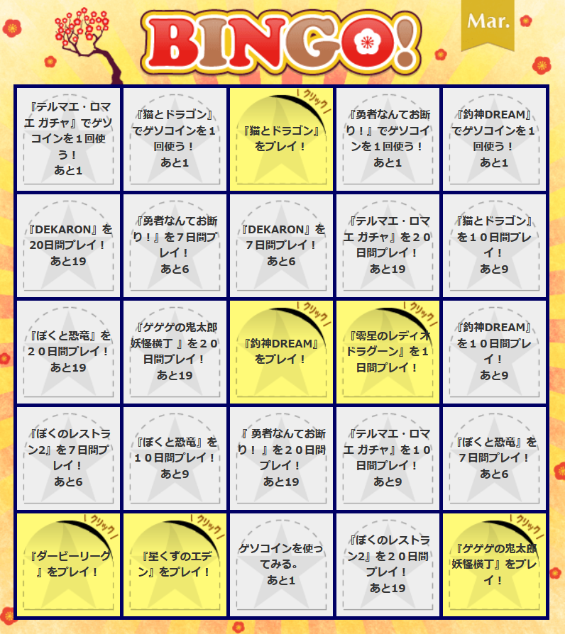 ーーー 広告 ---ーーーーーーーーーーゲソてん 2025年 3月ビンゴでスター・エッグがもらえるゲーム一覧です☆ゲーム一覧☆ゲソコインを使用1. テルマエ・ロマエ ガチャ2. 猫とドラゴン3. 勇者なんてお断り!4. 釣神DREAM ☆ゲーム一覧1. 猫とドラゴン2. DEKARON3. 勇者なんてお断り!4. テルマエ・ロマエ ガチャ5. ぼくと恐竜〜みんなで3分6. ゲゲゲの鬼太郎 妖怪横丁7. 釣神DREAM 8. 零星のレディオドラグーン 9. ぼくのレストラン210.ダービーリーグ11.星くずのエデンーーー☆BINGO!ーーーーーー☆報酬BINGOx1 : スターx30BINGOx2 : スターx30 + 50エッグBINGOx3 : スターx30BINGOx4 : スターx30+100エッグBINGOx5 : スターx50+300エッグBINGOx12: 1,000エッグ+ 山分け1,000エッグ:100ゲソコインに交換可能3,000エッグ:330ゲソコインに交換可能ーーー☆BINGOの並びGame Playだけだと 3 BINGOGame Play +どれかでCoin使用で5 BING今月も友達をつくらなくていいcoincoinplaycoincoinplayplayplayplayplayplayplayplayplayplayplayplayplayplayplayplayplaycoinplayplayーーー2025/3/1 10:30 公開ーーーー関連記事ーーーー2025/3/1 PontaゲームスPro マンスリーミッション(2025年3月)2025/3/1 ゲソてん 2025年3月ビンゴーーー2025/2/1 PontaゲームスPro マンスリーミッション(2025年2月)2025/2/1 ゲソてん 2025年2月ビンゴーーー2025/1/1 PontaゲームスPro マンスリーミッション(2025年1月)2025/1/1 ゲソてん 2025年1月ビンゴーーー2024/12/3 PontaゲームスPro マンスリーミッション(2024年12月)2024/12/3 ゲソてん 2024年12月ビンゴ