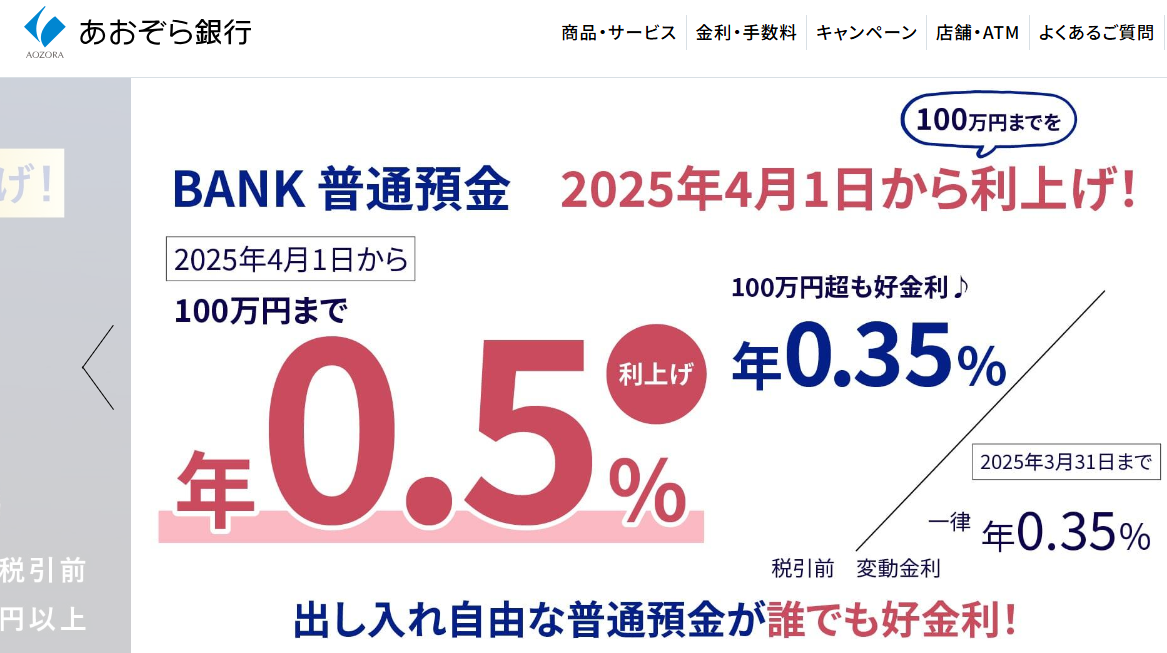 政策金利の変更で銀行の預金金利が上昇しましたが、2025年3月末現在の普通預金の金利がどうなっているかまとめてみました銀行名利率(通常金利)利率(条件付き)条件あおぞら銀行 BANK0.35%0.35%☆条件なし, 4/1から100万円まで0.5%auじぶん銀行0.21%0.51%/0.41%/0.21%証券口座連携+PAY引落+PAY連携(auマネカツなら最大0.51%)/それ以外SBI新生銀行0.21%0.4%/0.21%ダイヤモンドステージ(SBI証券と連携など)上限なし/それ以外オリックス銀行0.21%0.21%☆条件なし東京スター銀行0.20%0.4%/0.6%/0.20%給与または年金受け取り/資産運用商品を規定額保有/それ以外SBJ銀行0.20%0.5%/0.4%/0.3%/0.2%住宅ローン/年金受取/特別付与/それ以外GMOあおぞらネット銀行0.20%0.5%/0.2%ハピト支店口座で100万円以下/それ以外PayPay銀行(旧ジャパンネット銀行)0.20%0.4%/0.3%/0.2%年齢(30歳以上/未満)と残高に応じて金利が変化楽天銀行0.20%0.28%/0.22%/0.20%楽天証券と連携,~300万円楽天証券と連携 or 楽天カードの引き落としあり/それ以外住信SBIネット銀行0.20%0.21%/0.20%証券口座連携/それ以外イオン銀行0.20%0.25%/0.22%/0.21%/0.20%MyステージのスコアによるUI銀行0.20%0.20%☆条件なしソニー銀行0.20%0.20%☆条件なしセブン銀行0.20%0.20%☆条件なしー三井住友銀行0.20%0.20%☆条件なし他 多くの銀行0.20%ーー条件がなく金利が高いのは、あおざら銀行BANK の 0.35% だけのようです4/1からは 100万円までの金利が 0.5%になるようなのでここだけ別格です。(GMOあおぞらネット銀行 ハピト支店とおなじ)大手都市銀行の普通預金金利が 0.20% になったなか、 0.21% と(わずかな金利)差をつけている銀行がいくつかあります。また条件によって ~0.6% までの差をつけている銀行があります。価格変動リスクのある商品(投資信託・外貨預金など)の保有が条件に入らずに金利が高いのは、PayPay銀行証券口座と連携して金利が上がったり、給与・年金受け取り口座に指定して金利があがったり、預金する人の現在の状況に応じてお得な銀行はかわってきそうです。余裕資金がある人は、(1) 100万円をあおぞら銀行BANK(2) 200万円以上を PayPay銀行というのがお得なパターンのような気がします。以前は大手都市銀行にある資金をネット銀行に移動してみようかな…、という感覚になりましたが、今はそのままでもいい気がしてきました。ーーー2025/3/28 12:00 公開2025/3/29 5:30 googleで検索可能ーーー 広告 ーーーーーー 関連記事 ーーー2025/10/3 定期預金の利息と税金(利息の税金を0円にする預金方法)2025/3/28 2025年3月末現在の銀行の普通預金金利2024/12/16 2024年12月現在の銀行の金利の比較と口座開設に必要なもの2024/12/06 楽天PointClubの貯めトクモード キャンペーン:利用するのは難しそう