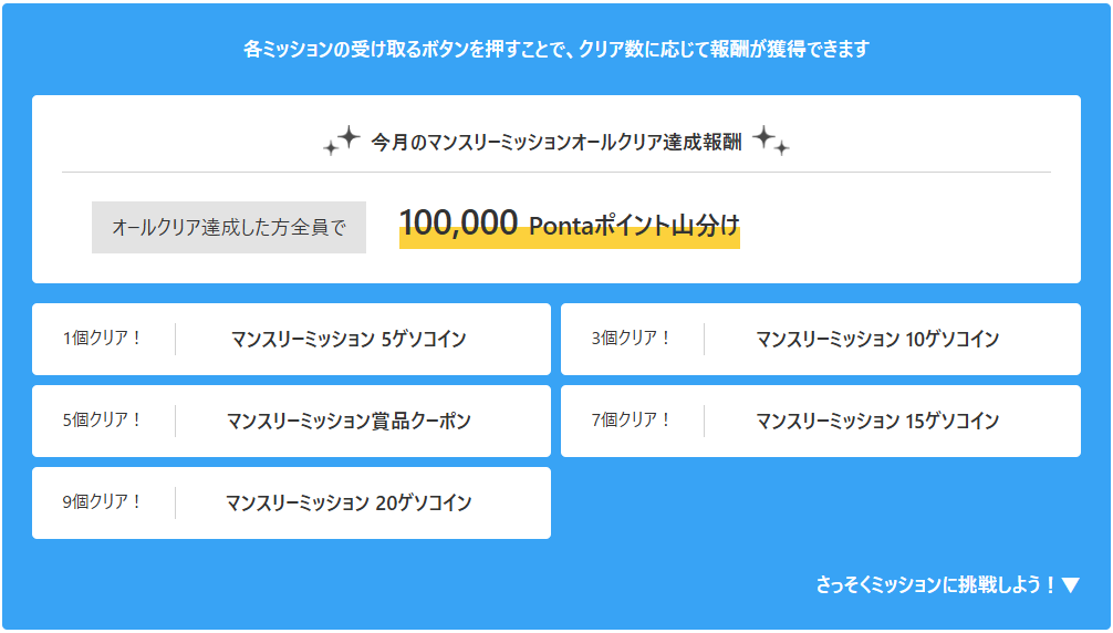 ーーー 広告 ーーーーーーーーーーーーーPontaのゲームサイト PontaゲームスProで毎月行われている、ミッション☆マンスリーミッション10個クリア:100,000 Pontaポイント山分け(最大200Pontaポイント)9個クリア:20ゲソコイン7個クリア:15ゲソコイン5個クリア:商品クーポン3個クリア:10ゲソコイン1個クリア:5ゲソコイン(課金しないでもらえる報酬がだんだんへっています)PontaゲームスPro(ログイン)☆ゲームでゲソコインを使用して達成1. ★テルマエ・ロマエ ガチャ:30ゲソコイン~2. ★猫とドラゴン3. ★勇者なんてお断り!:145ゲソコイン~4. ★釣神DREAM:100ゲソコイン~☆ゲームを遊んで達成5. ★ ぼくと恐竜〜みんなで3分6. ★ゲゲゲの鬼太郎 妖怪横丁7. ★零星のレディオドラグーン8. ★ぼくのレストラン29. ★星くずのエデン10.★ダービーリーグ☆ガチャチケ獲得(ガチャチケのみ)★DEKARON☆ガチャ→ガチャページへーーー2025/3/1 11:00 公開ーーーー関連記事ーーーー2025/3/1 PontaゲームスPro マンスリーミッション(2025年3月)2025/3/1 ゲソてん 2025年3月ビンゴーーー2025/2/1 PontaゲームスPro マンスリーミッション(2025年2月)2025/2/1 ゲソてん 2025年2月ビンゴーーー2025/1/1 PontaゲームスPro マンスリーミッション(2025年1月)2025/1/1 ゲソてん 2025年1月ビンゴーーー2024/12/3 PontaゲームスPro マンスリーミッション(2024年12月)2024/12/3 ゲソてん 2024年12月ビンゴ