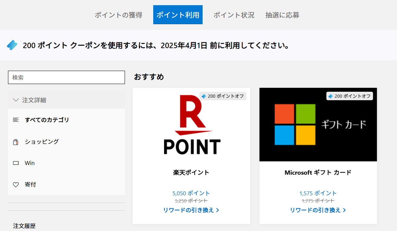 Microsoft Rewards のポイントが楽天ポイントと交換できる 5,250ポイント以上たまっていたので、楽天ポイント 660ポイントに交換してみました。3/31までの200ポイントのクーポンもあったので実際には 5,050ポイントを使用して、楽天ポイントが 660ポイントもらえました。そんなところに(お買い物マラソン中の買い物後に)楽天から「ポイント楽天株をはじめて 50ポイント受け取ろう」という案内がきたので、クリックしてみると…ポイント楽天株をはじめると 50ポイントもらえるようです100ポイントから投資できるようなので、さっそくはじめてみました。(ポイント楽天株)最低額の 100ポイントを追加してみますポイント楽天株主に登録されたようですポイント楽天株トップへ進んでみますどうやらポイント追加の手続きをした翌日に、株価の変動に応じてポイントが変動開始すると、50ポイントを受け取れるようです100ポイントなので楽天の現在の株価約 900円だと 0.11株相当になるようですしばらくして、ポイント実績を確認してみると…Microsoft Rewards でもらった (期間限定の)660ポイントで、ポイント楽天株をはじめたことになりますそして ポイント追加の翌日 17:30 以降にサイトをみてみると…「ポイントを受け取る」ボタンがありました。さっそく、押してみますポイントを受け取れたようですそしてポイント楽天株の画面の下のほうを見ると…スクラッチくじがありました「スクラッチを削りにいく」を押します「スクラッチを削る」ボタンが表示されたので押すと2人に1人ポイントがあたるということで1ポイントあたったようですポイント実績をみると、50ポイントがもう加算されているようですMicrosoft Rewards で検索などをしてもらった「楽天ポイント」のうち 50ポイント(49ポイント)を使って、ポイント楽天株 100ポイント分の0.11株獲得したことになります。なんとなく得した気分ですちなみに株価が下落したので、現在運用益はマイナスになっていますさすがに もらった50ポイント分マイナスになることはないだろう…(株価が半値になるなんてことは…)ーーー※ポイント楽天株の説明楽天の株価が上がるとポイントも増える(楽天の株価が下がるとポイントが減る)☆追加100ポイントから1ポイント単位で追加可能上限は (投資するポイントが)30,000ポイントまで楽天株式の毎日の終値でポイントが再計算される☆引き出し1ポイントから運用中ポイントの 90%まで指定できる(10%残さないといけない)すべて引き出すボタンもある引き出し時は楽天の株価に応じてポイント数が確定楽天株価が大きく下落して、指定したポイント数引き出せない場合はキャンセルされる※追加・引き出し時に手数料は必要ない投資の疑似体験をするサービス 実際に株式を所有するわけではないので ・議決権はない ・配当もない ・株主優待もない ということで、実際の株式よりメリットが少ない仕組みになっています おそらく株価が上がって利益を得た人が、楽天証券で口座を開設して、楽天株を購入する… といったことを期待する、販促ツールだと思います。 株価が下がっている間は、キャンペーンでポイントを配布しないと、利用者がどんどん減っていいきそうな気がしますーーー2025/3/27 21:00 公開2025/3/28 5:30 googleで検索可能ーーー 関連記事 ーーー2025/3/27 Microsoft Rewardsでもらった楽天ポイントでポイント楽天株をはじめてみました2025/2/19 Microsoft Rewardsのポイントが楽天ポイントと交換できるまでたまりました2025/1/24 検索してポイントをもらう:Microsoft Rewardsを試してみた2025/1/18 楽天ウェブ検索でもらえるポイント(山分けに参加できないIDにならないよう注意)2025/1/12 楽天ブログのブロ活って? ポイントがもらえるのはどういう人?(自分も初ポイント?)2024/12/6 楽天PointClubの貯めトクモード キャンペーン:利用するのは難しそうーーー 広告 ーーーーーー2025/4/2楽天の株価はここ1か月、下がり続けているようです1週間で7%の下落です。どこまで下がるのだろう?
