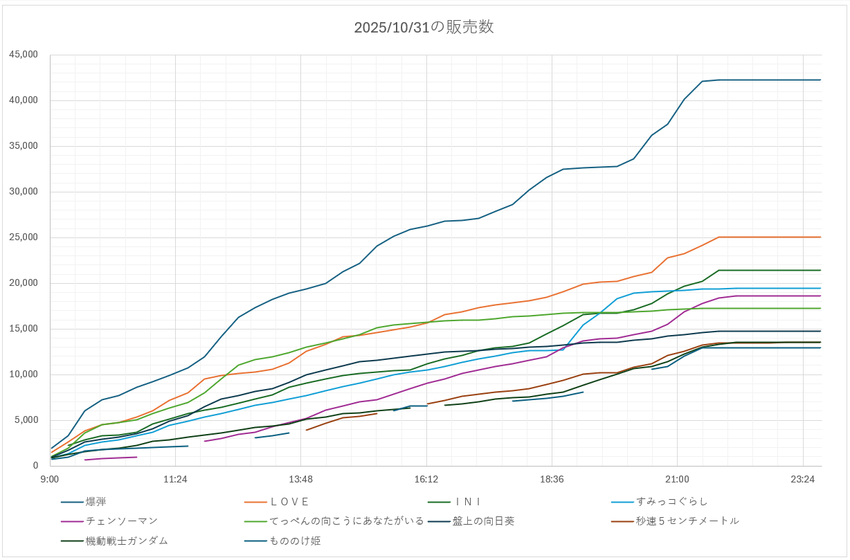 2025/10/31から新しい映画・爆弾・(LOVE SONG)・INI THE MOVIE「I Need I」・映画 すみっコぐらし 空の王国とふたりのコ・てっぺんの向こうにあなたがいる・盤上の向日葵・特別編集版 機動戦士ガンダム 鉄血のオルフェンズ ウルズハント 小さな挑戦者の軌跡・劇場先行版「ゴールデンカムイ」札幌ビール工場編 後編・火の華・ひとつの机、ふたつの制服・じっちゃ!・サムシング・ハプンズ・トゥ・ミー・あの時、愛を伝えられなかった僕の、3つの“もしも”の世界。・恋人たち・ヒア・アンド・ゼア…の公開が始まりました。☆公開初日のチケット販売数公開初日のチケット販売数(興行収入を見守りたい!)の推移は次のようになっています今週はランキングに大きな変化があって、鬼滅の刃、国宝が上位(~10位)にはいっていません爆弾がだんとつ1位になっています。土日はどのようになるでしょうか?ーーー☆座席数2025/10/30順位 座席数 回映*1 381524 1259 劇場版「チェンソーマン レゼ篇」*2 182558 *947 秒速5センチメートル*3 154536 *713 劇場版 鬼滅の刃 無限城編 第一章 猗窩座再来*4 117696 *616 劇場版 おいしい給食 卒業*5 114156 *797 愚か者の身分2025/10/31*1 270840 1031 劇場版「チェンソーマン レゼ篇」*7 108434 *567 劇場版 鬼滅の刃 無限城編 第一章 猗窩座再来*9 *95398 *624 秒速5センチメートル(新作)*2 220139 1022 映画 すみっコぐらし 空の王国とふたりのコ*3 187409 *771 爆弾*4 141505 *983 盤上の向日葵*5 137868 *909 てっぺんの向こうにあなたがいる*6 110279 *453 特別編集版「機動戦士ガンダム 鉄血のオルフェンズ ウルズハント10 *86059 *540 (LOVE SONG)11 *62748 *326 INI THE MOVIE「I Need I」12 *51913 *343 劇場先行版 アニメ「ゴールデンカムイ」札幌ビール工場編 前編2025/11/1*1 318213 1166 劇場版「チェンソーマン レゼ篇」*2 266953 1242 爆弾*3 263163 1222 映画 すみっコぐらし 空の王国とふたりのコ*4 134326 *979 盤上の向日葵*5 130155 *667 劇場版 鬼滅の刃 無限城編 第一章 猗窩座再来*6 128215 *911 てっぺんの向こうにあなたがいる*7 126010 *850 (LOVE SONG)*8 *99471 *657 秒速5センチメートル*9 *97857 *465 特別編集版「機動戦士ガンダム 鉄血のオルフェンズ ウルズハント 10 *53712 *319 INI THE MOVIE「I Need I」ーーー2025/11/1 11:00ーーー 広告 ーーーーーー☆初日以降の販売数2025/11/1の販売数チェンソーマン、爆弾、すみっコぐらし、鬼滅の刃、秒速5センチ、もののけ姫、(LOVE SONG)、盤上の向日葵、てっぺんの向こうにあなたがいる、国宝ーーー2025/11/2の販売数チェンソーマン、爆弾、すみっコぐらし、鬼滅の刃、秒速5センチ、(LOVE SONG)、もののけ姫、盤上の向日葵、てっぺんの向こうにあなたがいる、国宝「チェンソーマン」と「爆弾」がほぼ同じ販売数です。ーーー2025/11/3の販売数爆弾、チェンソーマン、すみっコぐらし、秒速5センチ、鬼滅の刃、もののけ姫、てっぺんの向こうにあなたがいる、盤上の向日葵、国宝、INI「爆弾」が1位、リードしました。平日はどうなるでしょう?舞台挨拶中継があった「INI THE MOVIE」が特定の回の入場者で 10位にはいっています。ーーー2025/11/4の販売数爆弾、チェンソーマン、てっぺんの向こうにあなたがいる、秒速5センチ、もののけ姫、盤上の向日葵、鬼滅の刃、すみっコぐらし、国宝、(LOVE SONG)「爆弾」がダントツ1位です。平日になると「すみっコぐらし」の入場者が少なくなって、「てっぺんの向こうにあなたがいる」が上位に入ってきます。ーーー2025/11/5の販売数爆弾、チェンソーマン、てっぺんの向こうにあなたがいる、秒速5センチ、もののけ姫、盤上の向日葵、国宝、鬼滅の刃、(LOVE SONG)、すみっコぐらしーーー2025/11/6の販売数爆弾、チェンソーマン、てっぺんの向こうにあなたがいる、秒速5センチ、国宝、盤上の向日葵、もののけ姫、鬼滅の刃、(LOVE SONG)、すみっコぐらしーーー販売数比較土曜、日曜は「爆弾」が2位、「すみっコぐらし」が3位、月曜(祝日)は「爆弾」が1位、「すみっコぐらし」が3位と上位争いに加わっています。ーーー☆舞台挨拶中継・(LOVE SONG)11月2日(日) 12:00の回(上映後舞台挨拶中継) 15:15の回(上映前舞台挨拶中継)・INI THE MOVIE「I Need I」2025年11月3日(月・祝)10:15上映回ーーー☆入場者プレゼント・富士山と、コーヒーと、しあわせの数式【特製ポストカード】・映画すみっコぐらし 空の王国とふたりのコ第1弾:エビフライドンフィギュア・機動戦士ガンダム 鉄血のオルフェンズ ウルズハント -小さな挑戦者の軌跡入場者特典 第1弾 【配布期間】2025年10月31日(金)~11月6日(木)・(LOVE SONG)映画オリジナルチェキ風カード・劇場先行版 アニメ『ゴールデンカムイ』 札幌ビール工場編【後編】特製ポスターステッカーセット4種のステッカーが1枚のシートになっています。4種は1枚ずつ切り離せます。シートサイズ:縦152mm×横108mm