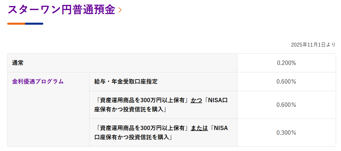 普通預金の金利が高い銀行を調べようといろいろ検索してみたのですが、特定の条件を満たすと金利が高くなるという銀行が多いようで、(自分が)わかりやすいサイトがみつかりません。自分で調べた結果をまとめておきます。ちなみに都市銀行の普通預金の金利は年0.20%になっています。2025/11/5 現在の調査結果銀行普通預金(通常)普通預金(優遇時最大)優遇条件みずほ銀行他0.20%ーー東京スター銀行0.20%0.60%給与振込 or 年金振込 or 資産運用(NISA+300万)〃0.20%0.30%資産運用(NISA or 300万)auじぶん銀行0.21%0.55%残高1000万円以上〃0.21%0.51%PAY/カード/証券口座連携(まとめて金利優遇)+au対象プラン〃0.21%0.41%PAY/カード/証券口座連携(まとめて金利優遇)島根銀行スマートフォン支店0.50%スマートフォンアプリ専用UI銀行0.20%0.50%給与振込 or 年金振込 or 女性あおぞら銀行BANK支店0.35%0.50%100万円まで優遇GMOあおぞらネット銀行ハビト支店0.20%0.50%100万円まで優遇楽天銀行0.20%0.44%各種条件で0.01%~0.06%合計0.16%付加 (楽天ブラックカード使用で+0.06%など)〃0.20%0.28%証券口座連携(楽天証券)300万円まで〃0.20%0.22%楽天カードの口座振替SBI新生銀行0.21%0.42%証券口座連携(SBI証券)〃0.21%0.40%ステップアッププログラム(各種条件)+28歳以下 or 60歳以上MATSUI Bank0.41%ー証券口座連携(松井証券口座がないと開設できない)SBI FXトレードNEOBANK0.40%ーFX口座連携(SBI FXトレード口座がないと開設できない)ローソン銀行0.40%ーーPayPay銀行0.20%0.50%利息ではなくポイント付与の場合+0.1%(条件は以下)〃0.20%0.40%30歳以上の場合は200万円以上の残高, 29歳以下なら100万円以上の残高で優遇SBJ銀行0.20%0.40%年金受取〃0.20%0.30%通帳なしきらやか銀行SBIさくらんぼ支店0.30%ースマートフォンアプリ専用野村信託銀行0.25%ー証券口座連携(野村證券口座がないと開設できない)イオン銀行0.20%0.25%Myステージ(各種条件)住信SBIネット銀行0.20%0.21%証券口座連携(SBI証券)ある残高まで金利を優遇する あおぞら銀行BANK支店や楽天銀行に対して、残高が多いと金利を優遇する auじぶん銀行やPayPay銀行。銀行の特徴があって、簡単には比較しにくくなっています。大手都市銀行の定期預金の金利より高い 0.5%以上の金利のところは黄色にしました。資産運用が優遇条件に入っていると運用商品で損益を出す可能性があるので、普通預金の金利優遇条件としてはいまいちな気もします。証券口座連携だけなら、資産の運用はしなくてもいいので、リスクは少ないのですが、(人によっては)よけいな口座を作ることがいやな人もいるかもしれません。証券口座連携は緑色にしましたスマホアプリ専用の支店を用意した銀行も最近増えてきているようです。(老眼がすすむ)高齢者にはちょっと厳しい条件かもしれません。ーーー 広告 ーーーーーー2025/11/5 22:00ーーー☆銀行サイトへのリンク・東京スター銀行・auじぶん銀行プレミアム金利まとめて金利優遇・UI銀行はたらくサイフまもりのサイフ女神のサイフ・島根銀行 スマートフォン支店☆あおぞら銀行 Bank支店☆新生銀行SBIハイパー預金ステップアッププログラム☆楽天銀行ボーナス金利☆MATSUI Bank☆SBI FXトレードNEO BANK☆ローソン銀行☆PayPay銀行ステップアップ円預金☆SBJ銀行年金プラスα普通預金プラス☆イオン銀行Myステージーーー☆普通預金の金利を比較しているサイト・ダイヤモンド・オンライン・かぶたん・おかねこ