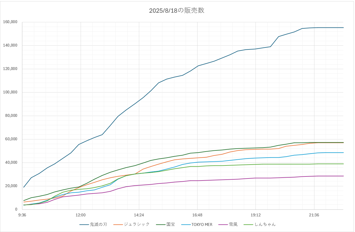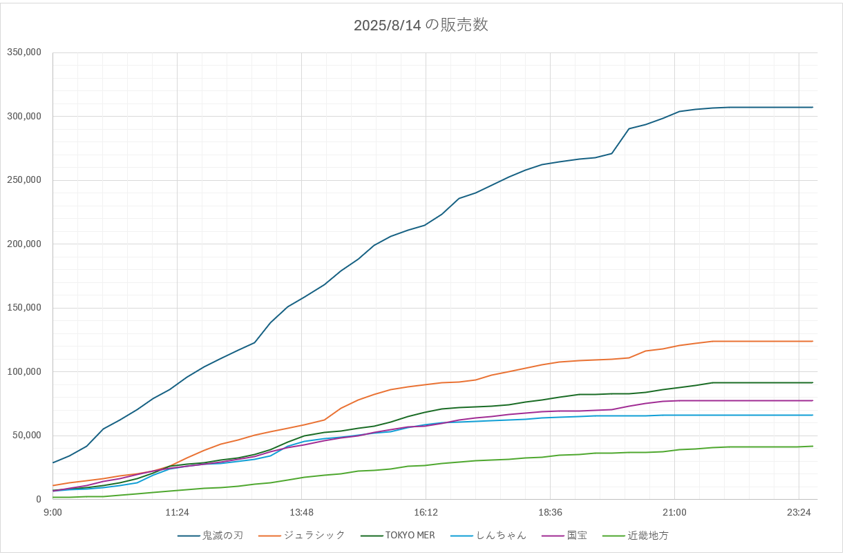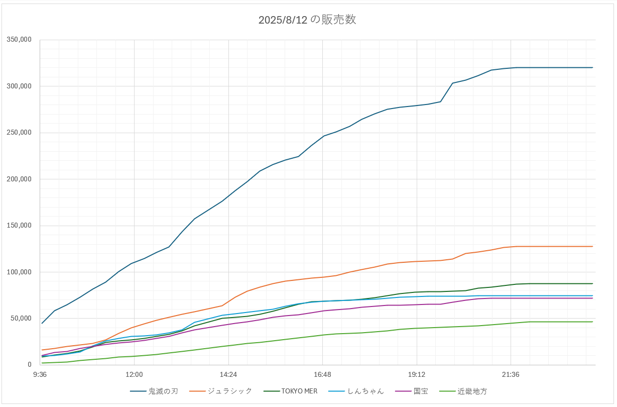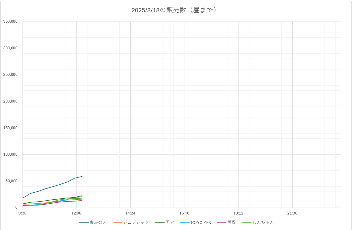 2025/8/18 の昼までの販売数のグラフは次のようになっていて、(国宝以外は)だいたい前の週の 40%程度になっています。(鬼滅の刃:43%, ジュラシックワールド:34%, しんちゃん:39%, MER:40%)