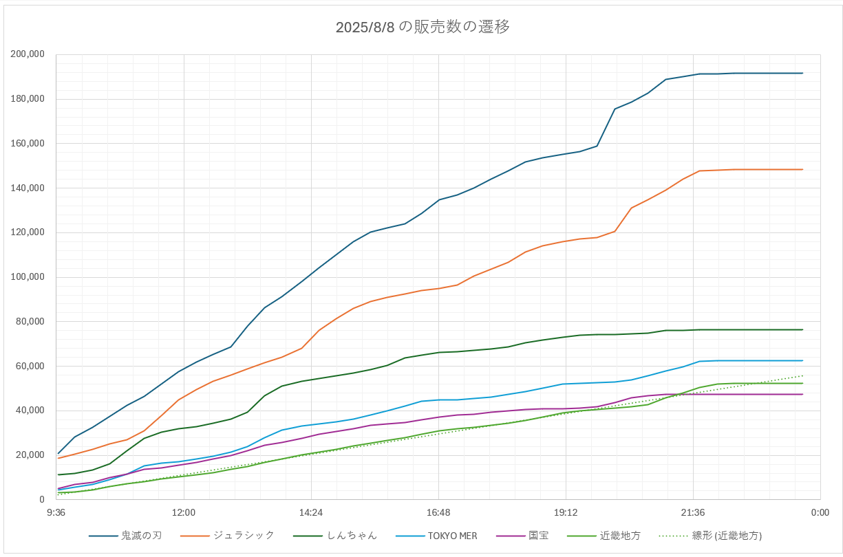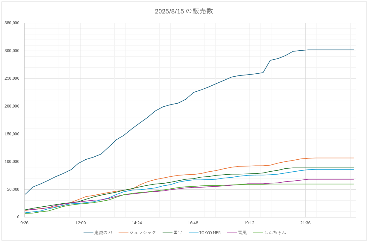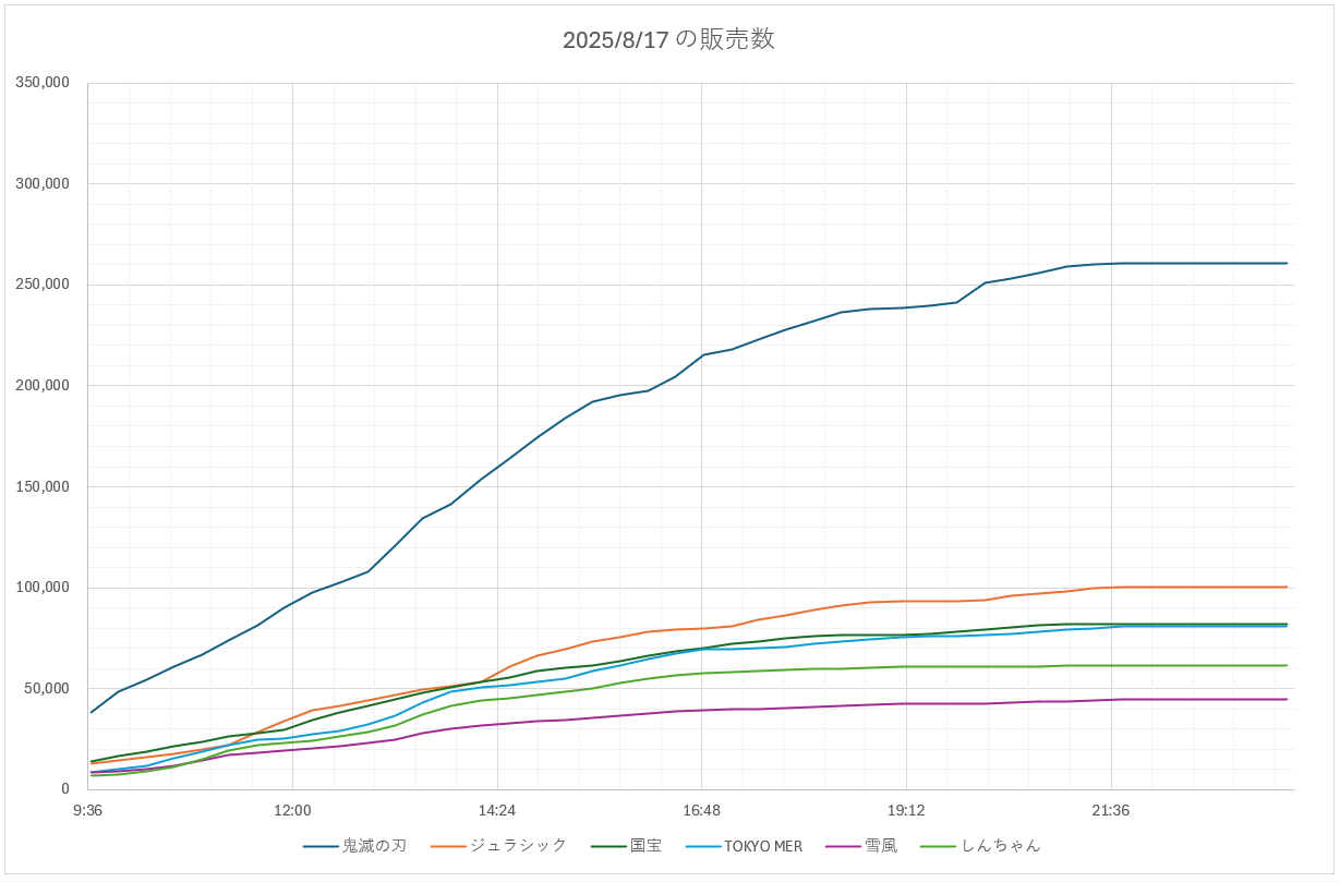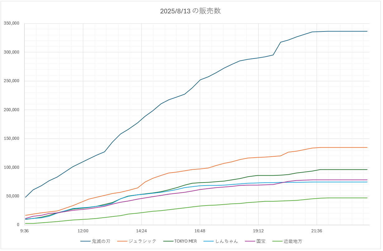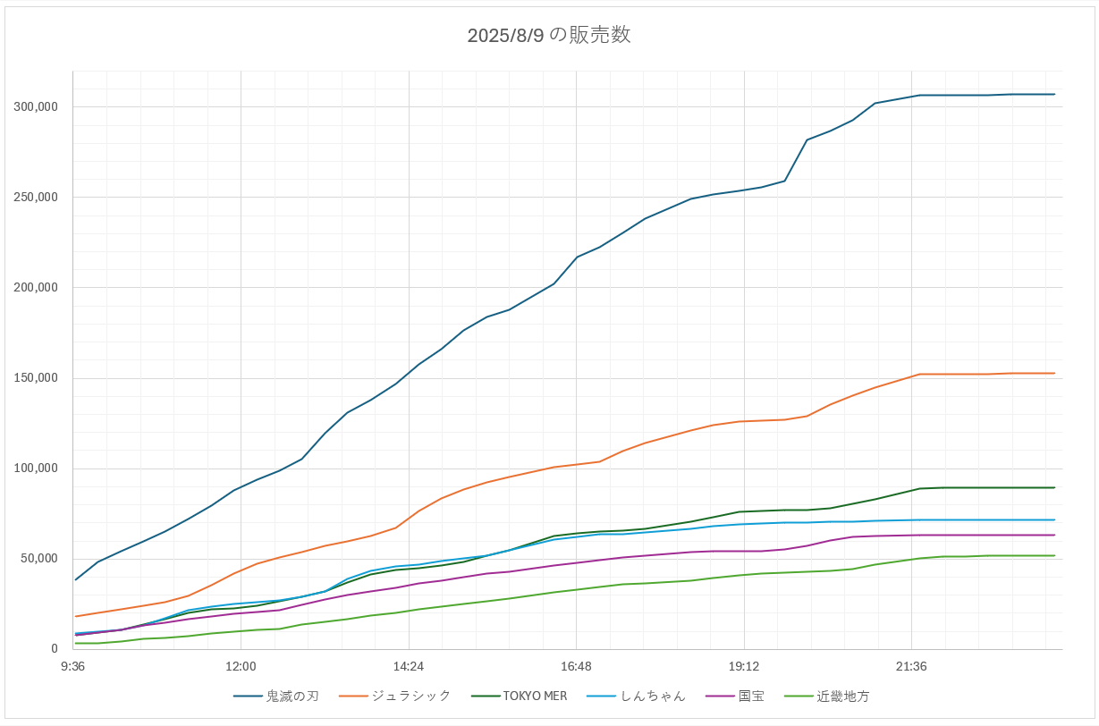 2025/8/18 の昼までの販売数のグラフは次のようになっていて、(国宝以外は)だいたい前の週の 40%程度になっています。(鬼滅の刃:43%, ジュラシックワールド:34%, しんちゃん:39%, MER:40%)