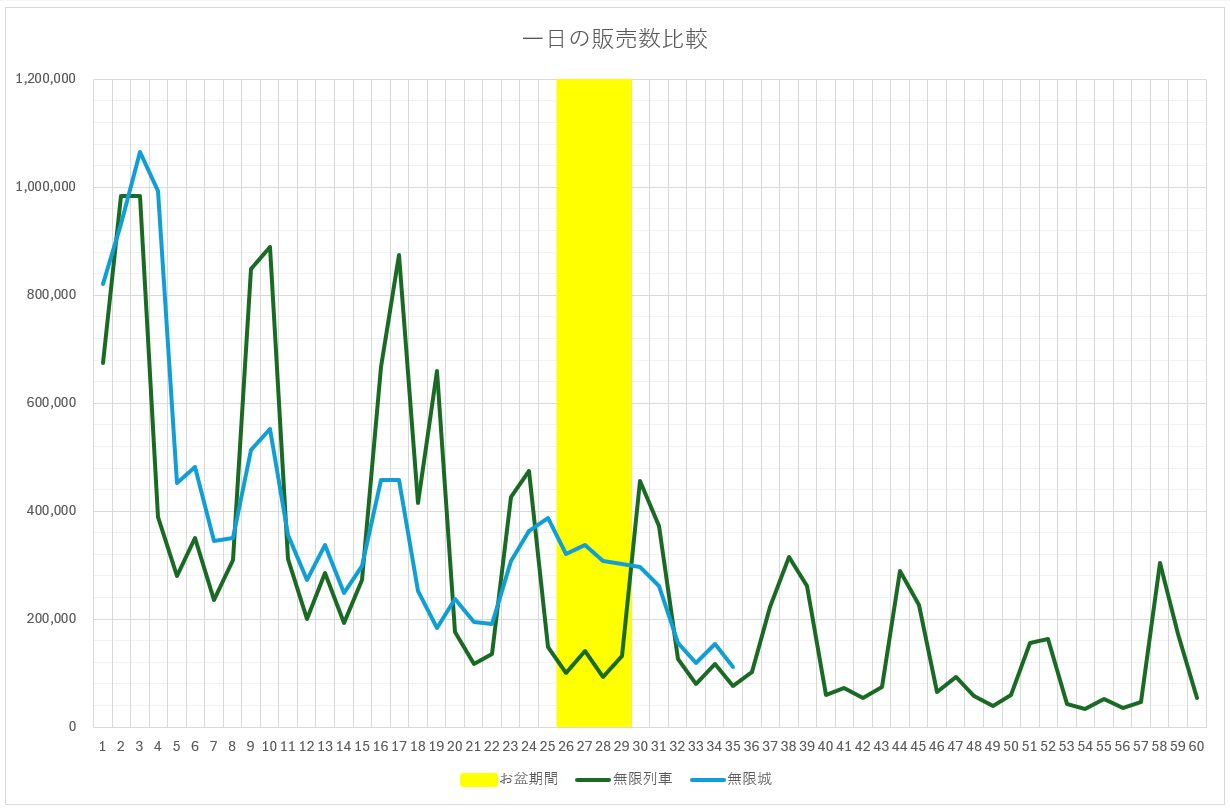 販売数の遷移を 鬼滅の刃 無限列車編と無限城編で比較すると、無限城編の販売数がお盆期間に増加したことがわかります