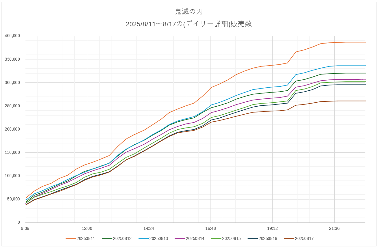 2025/8/11~2025/8/17の期間について鬼滅の刃の一日の販売数推移をグラフにまとめると
