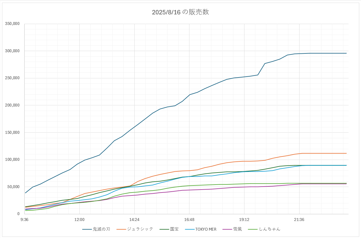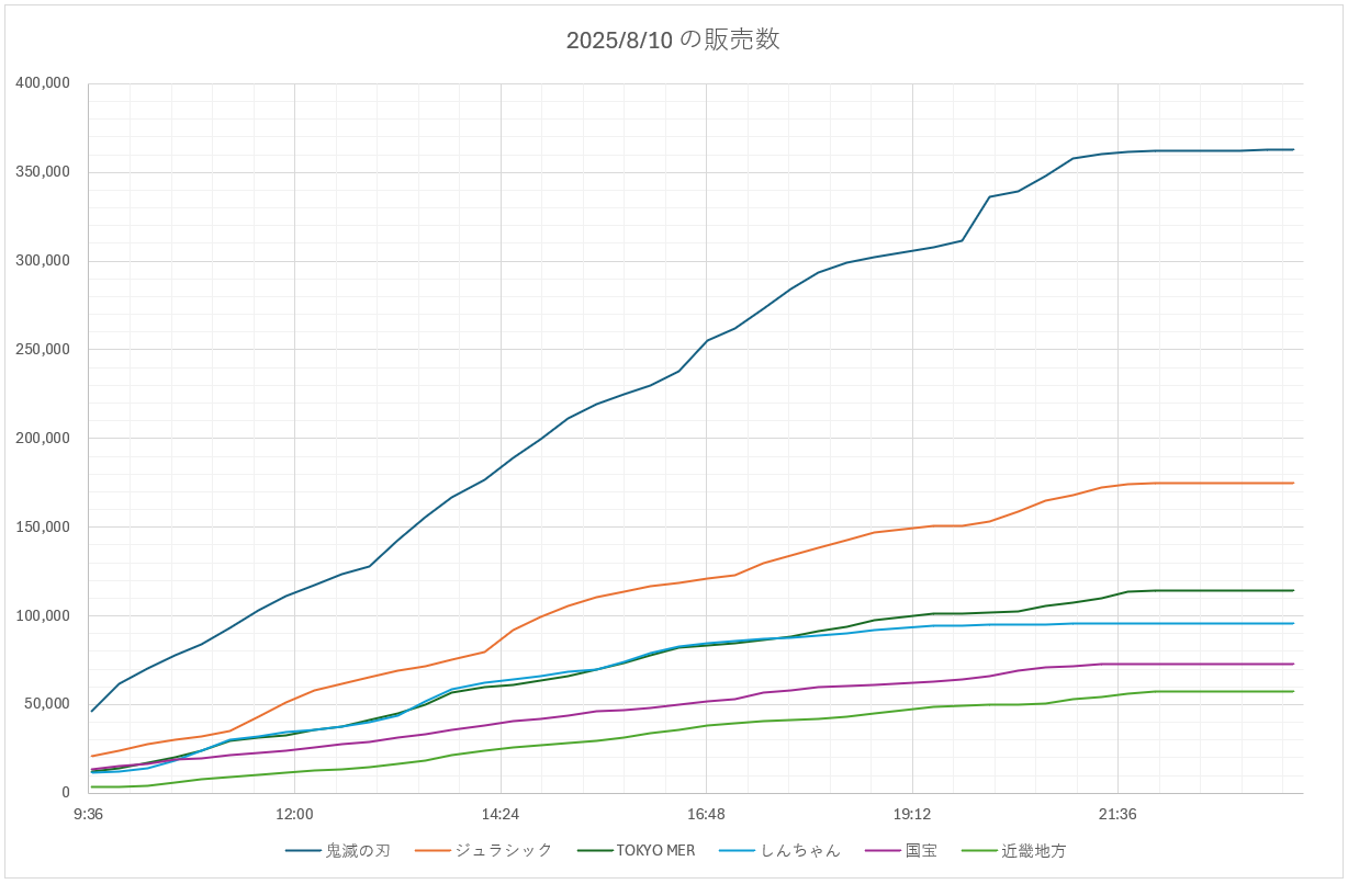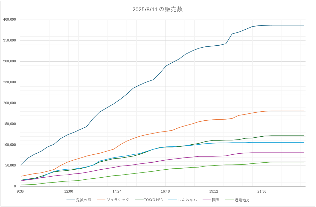 このペースだと鬼滅の刃は今日(8/18)の販売数は15万程度になりそうです。
