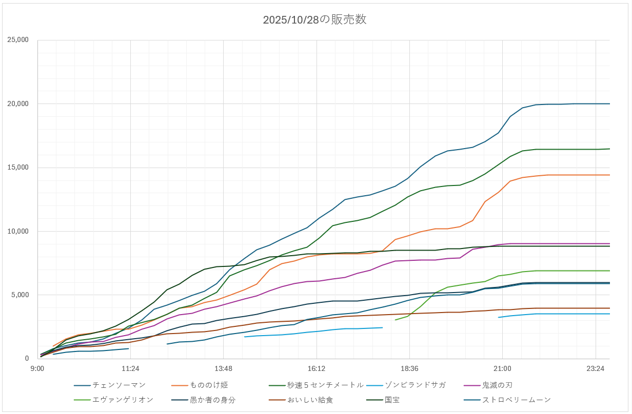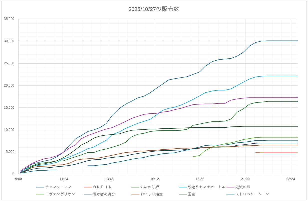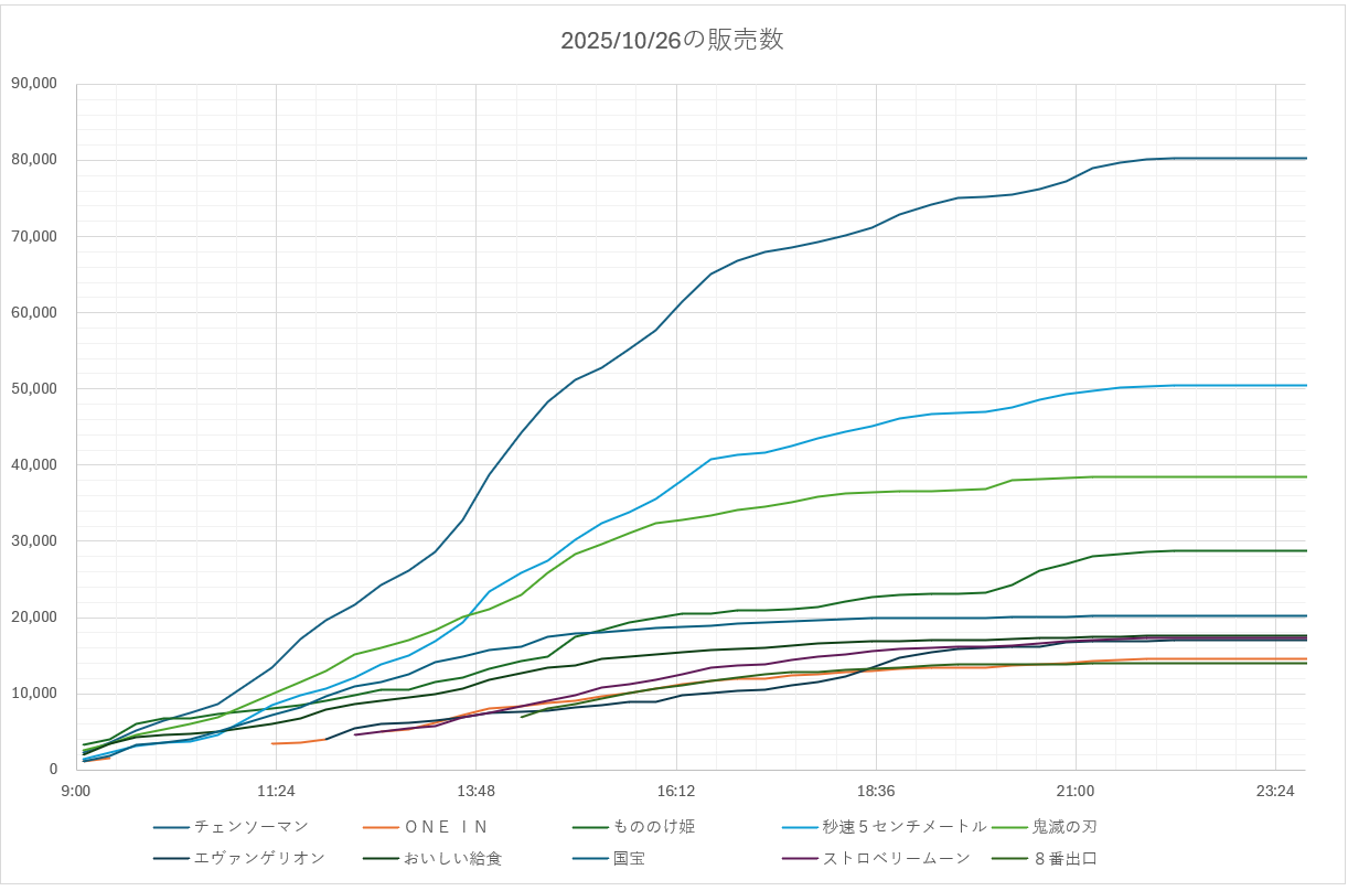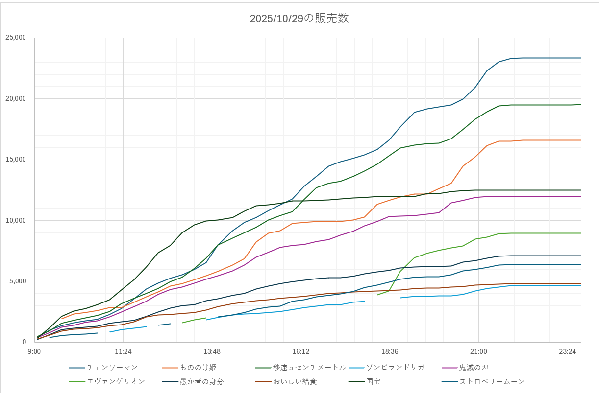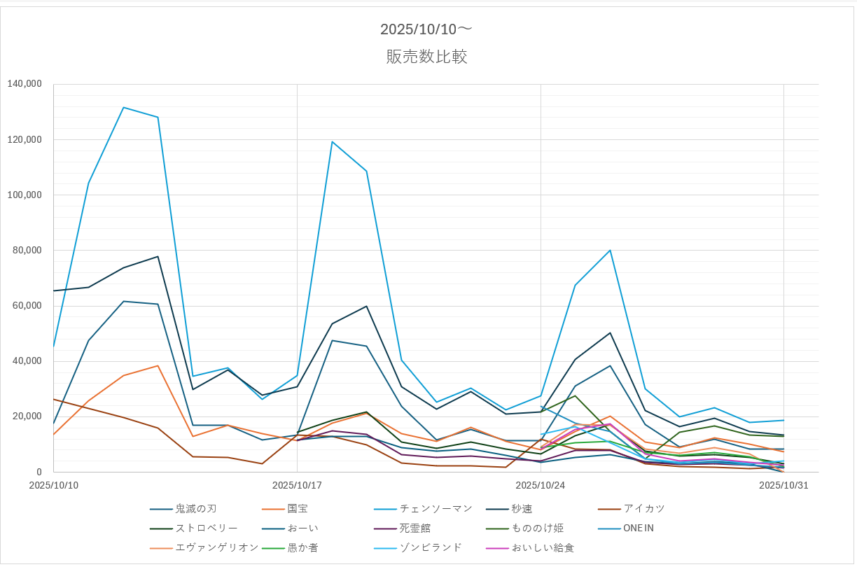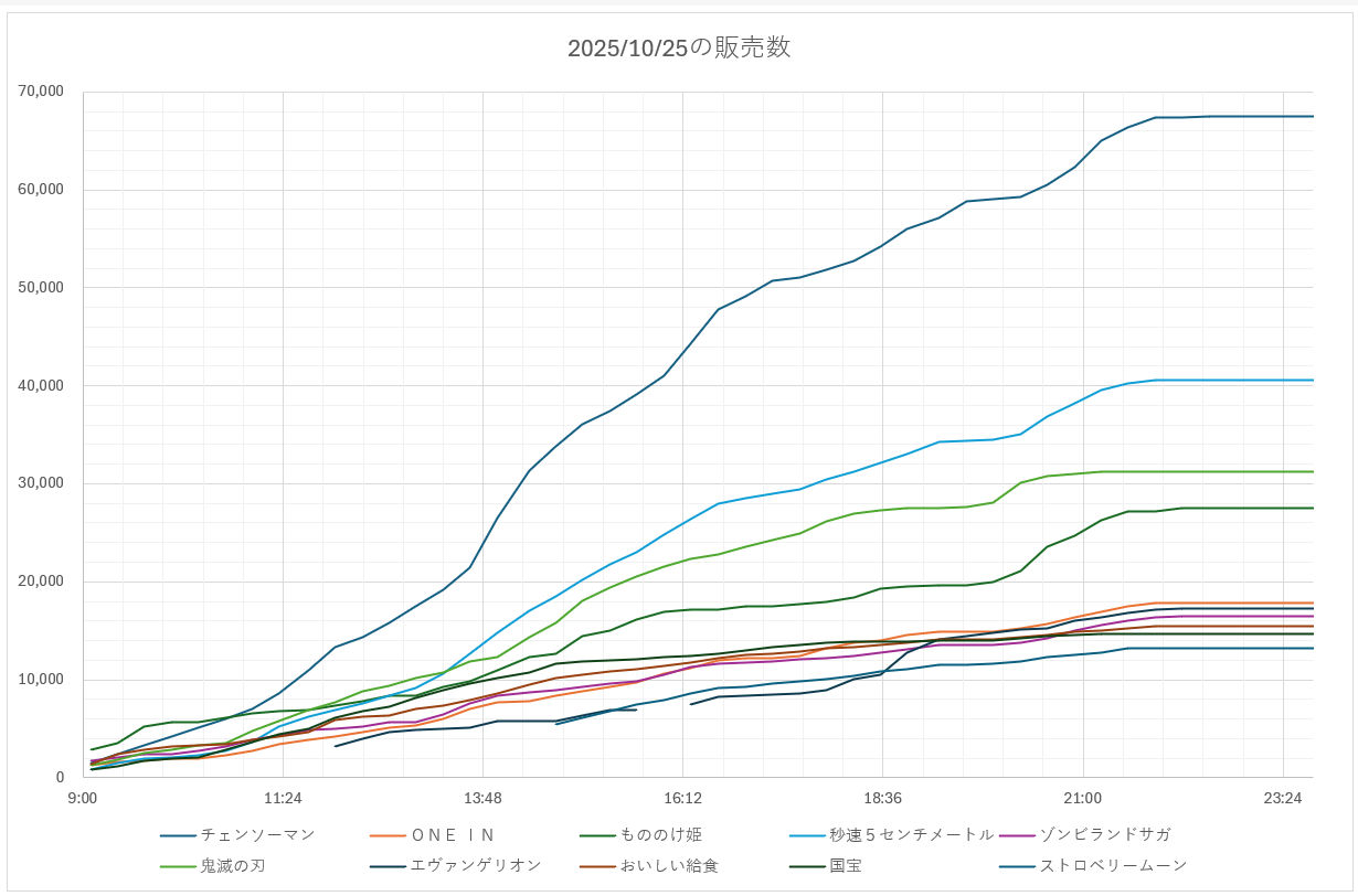 土日になると、チェンソーマン、秒速5センチ、鬼滅の刃が1~3位になっています