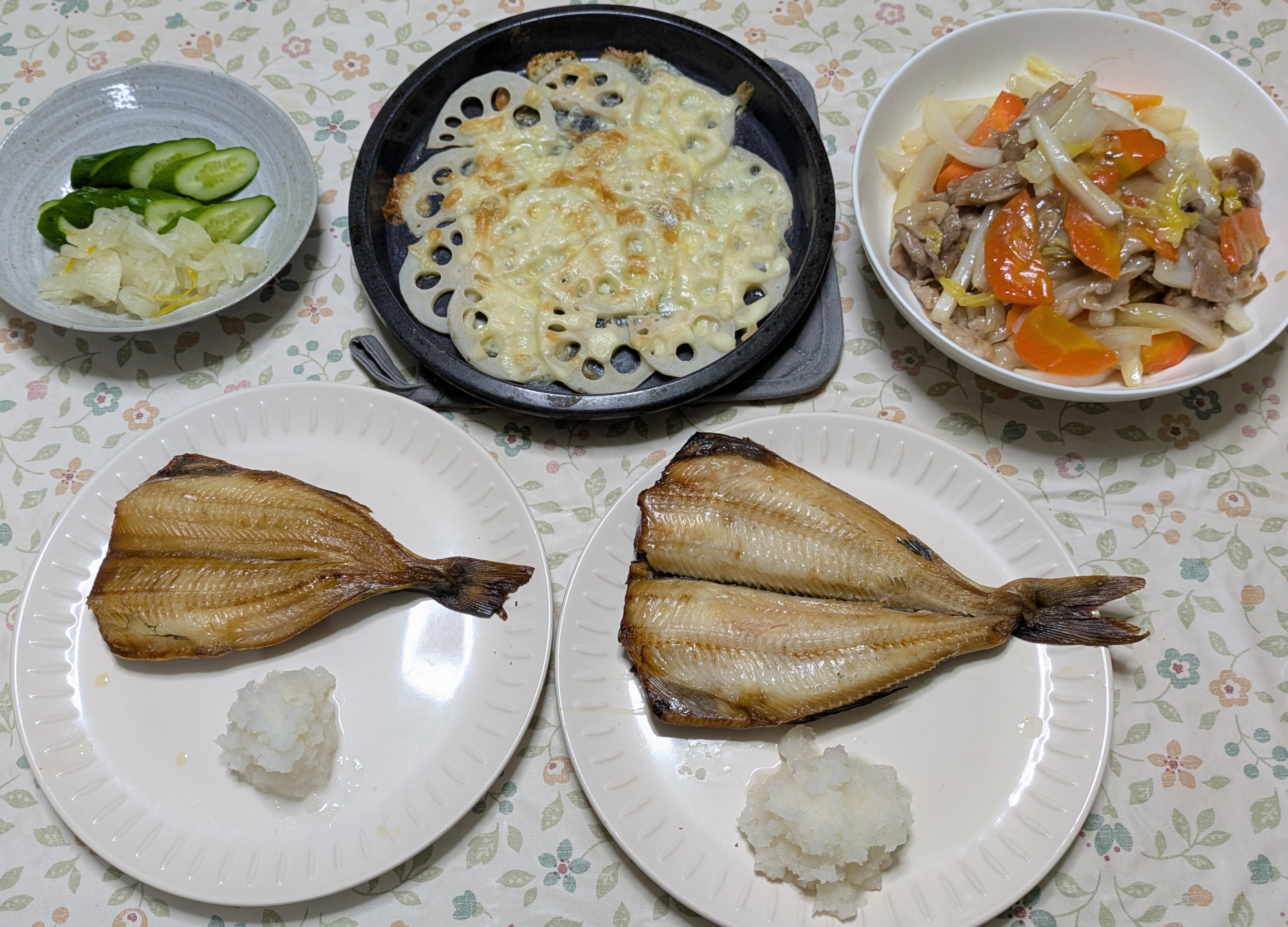 ここに、2、3日風邪をひいたらしく、やる気ゼロ一日、本を読んで、録画してあるドラマを観て、時々眠ってと、過ごしておりましたとは言えご飯の支度、お弁当の準備はしましたよ~~(笑)夕飯は〜1/13縞ホッケ豚肉、白菜、人参の中華炒めレンコンのチーズ焼き浅漬け1/14大根の煮物きゅうりと人参のナムル風えのきのチヂミそれと、豚バラ肉とモヤシ、キャベツの蒸し煮一昨日は食欲がなくて、私は夕飯パス夫一人でこの鍋を平をらげていました(笑)昨日はちょっと元気になって、買い物に出かけましたお刺身、豚肉の生姜焼きポテトサラダ奴には韓国海苔を散らしましたお弁当は〜中華丼鮭チャーハン煮物今日は味噌漬けと玉ねぎと炒めた豚丼毎日、みかん付きです(笑)まずは健康が大事と本調子じゃない時はだらだらしながら、体を休めるようにしていますもう無理できる年齢ではないと自分を甘やかします(≧∀≦)今日は少しだけやる気がでてきたので(笑)散歩に出かけようと思っています