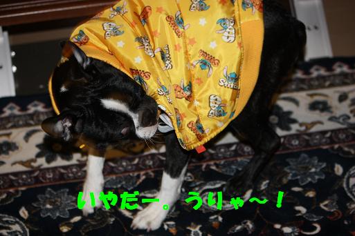 今日も寒かったですね~。3連休明け・・。ぼちぼち仕事を片付けて家に戻るとガウガウと吠えながら、飛びかかってくる白黒が一匹~。どうも、連休中ずっとかまってあげたので、その反動が出たのか遊ぼうとアピールしているようなのですが、そうは言え、家に戻って、いきなりハイテンションにはなれない私もおりー。なので、新しい洋服でも着せて気分でも変えようかとチャレンジしましたが、ご覧のとおり、グルグル回って、はじっこに噛みつき攻撃でした。やれやれ・・。でも、もう1着あるので、明日は別バージョンで着せ替え大会、やってみます。