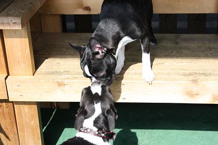 今日も、ぼちぼちのお天気。YABUTA君のお薬をもらうついでに、運動不足解消にといつものドッグランに行くと、先客様に白黒模様のお犬様の姿が・・。おそるおそるお邪魔してみると、まさにおみごとなボストン:そら様(♂)とミックスのはな様(♀)のお二人・・。近所では、白黒模様をあまりお見かけしないので、YABUTA君も嬉しかったのでしょうか、大ちょっかい大会となりました。そら様には遊ぼうとじゃれていたのですが、さすがに年の差が勝りぎゃんぎゃんに負かされておりました。その後、はな様にもちょっかいをしかけたものの怒ると怖いはな様にも一喝され、あえなくお二人のまわりを走り回ったYABUTA君の1日となりました。でも、二匹様とも洗練された落ち着いた感じで、飼い主様からもいろいろと教えていただき、お名刺までいただきました。YABUTA君、まだまだ世間慣れしておりませんが、頑張って立派な?犬に育ててあげようと、つくづく勉強になった1日でした。はな様そら様、また近所にお立ち寄りの際は、遊んでくださいね。
