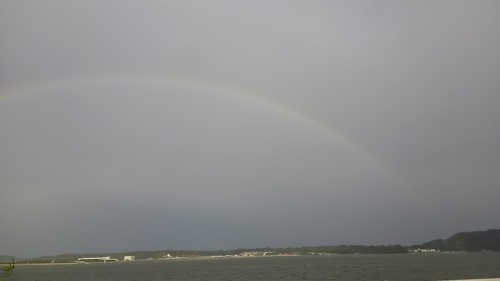 中上級コースを受講。多分20名前後。今日?からNC750L(教習仕様)が解禁になったので、乗る人いませんか?と声掛けがあったものの、バンク角が少なく、パワーも低めで「1300に乗り換えると開放感いっぱい」(N村イントラさん)というほどの感じらしい。イントラさんは、大会で使用するらしく、ここ1ヶ月くらいは750縛りらしい。今日のレンタルは、本当に何年かぶりに1300(ABS)。通常1300側からスタートだけど、最後尾に(と言っても私を入れて3人の1300が最後尾につきました)ついてスタート。結構、やはり恐い。でも、練習の一環で「一瞬全開」をやってみると、徐々にだが、アクセル開度を大きくすることができました。最後のコテコテ系がはやりしんどかったです。ちなみに今日のレンタル車両はスピードのピックアップが壊れているらしく、速度計とトリップ(たぶんODOの積算も)が動かず、ずっと0のままでした。なので、本日の走行距離は不明です。今日は浜名湖に着く頃は、曇り、その後練習中は結構晴れていた。でも帰り際は夕立(ゲリラ豪雨までは全然いかなくて問題なかったです)。レインボーを出てすぐくらいに湖畔にかかる虹が出ていました。曇り(雨)の中でしたので、鮮明ではないですが、結構大きな虹でした。写真を慌てて撮りましたが、良く見えないかな。でもスマホは便利。だた、手袋では反応しない(もちろん反応する手袋やスマホもあるけど)のが、玉に瑕かな?次回は14日です。