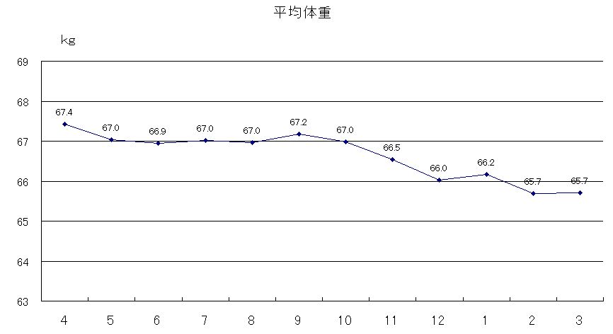 昨日はうっかりブログを書くのを忘れていた。ネタが殆どないので、しょうがない。閑話休題2014年度も、今日でお終い。年間体重グラフを、帰国後にそれなりにつけた。年間で1.7kg減、平均体重66.6kgという結果でした。最近は65kg台を維持できているので、来年度は64kg台に突入したい。