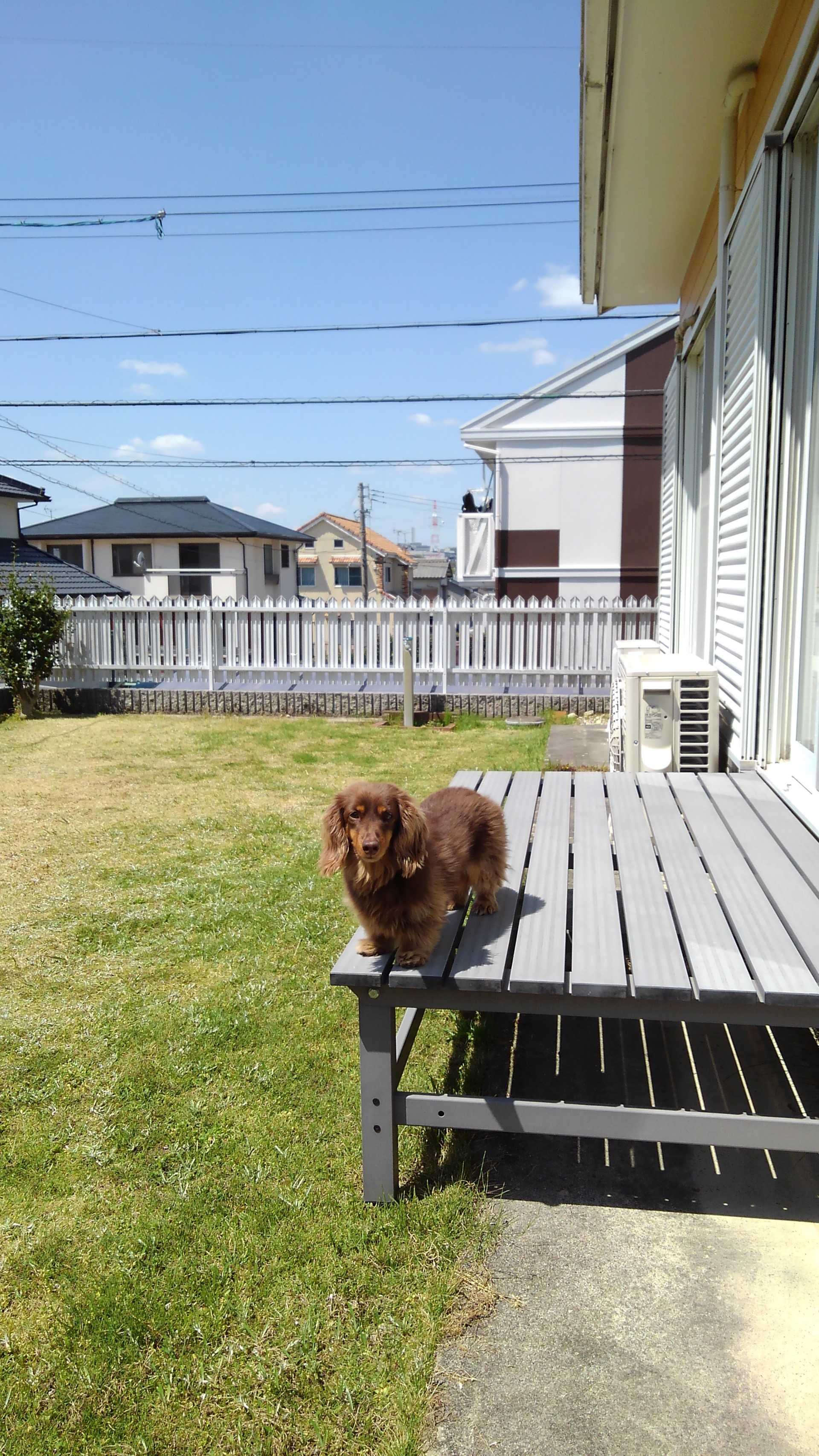 今日は朝からいい天気です。 5kmほどジョギングして、その後干しておいたオフ用ブーツを片付けるために庭に出ると、ワンコも出てきました。 少し風はあるものの、暖かな日差しでワンコも日向ぼっこです。 このまま暖かくなるとよいですね。