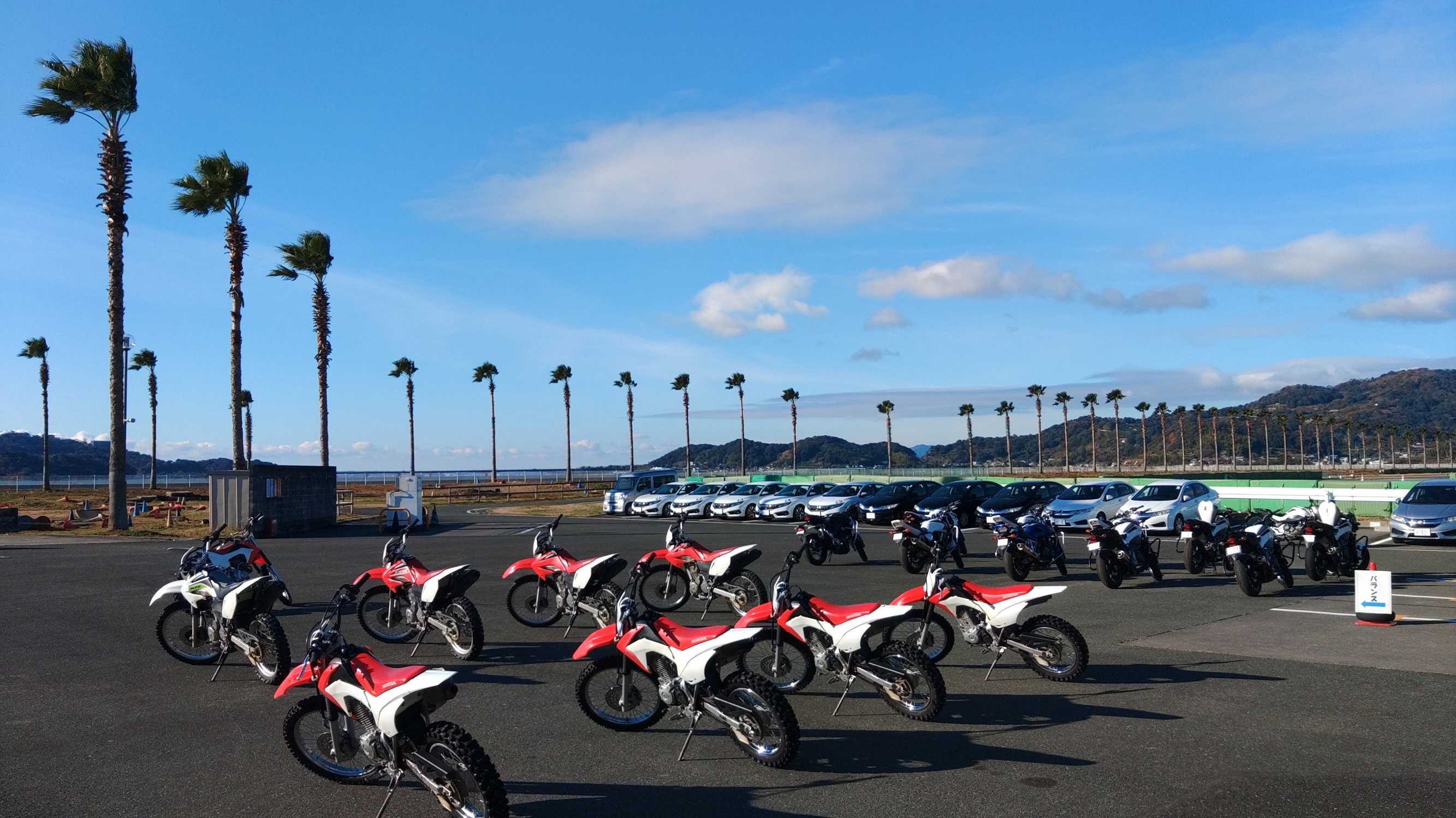 8の字が1日8の字になってから2回目です。先週バランス、今週8の字と基礎連が続きます。参加者は20名、バイクは1300。イントラはメインN村さん、サブT名網さん。自分のスペースとパイロン2本が与えられ(もちろん希望すればパイロン追加OK)、2回ほど「もしやりたければ」と練習課題も出ましたが、基本黙々と8の字を1日実施します。午前中の課題は、「先に態勢を作る」。ターンの内側に事前に荷重をかけておいて、反対のステップに加重を掛けてバランスをとり、ターン前にステップの加重を緩めてターンします。これは中々苦手で、ちょっとやってみたけど早々に通常の8の字旋回の練習に戻ります。と言っても、今日は朝から風もつよく寒い。身体が動かないのは当然だが、更に首から左腕がしびれるように痛い。乗る位置もスッキリ来ない。朝2から動画撮影をしてもらうが、もっさりと走っている。とりあえず朝一ということもあり、T名網からは「もう少しバイクを寝かせたら」くらいでした。午後からはN村さんからの撮影。動画を見て「どうですか?」と言われても「そんなに悪くない」感じだと伝えたら、「そうなんですよ。可もなく不可もなく、ですね」とコメント。この後どうしたいか、「小さく回る、早く回る、など目指す方向に寄って練習、走行方法もかわります」と言われました。一旦、悪くない状態にもどったようです。その後は、小回りしてみたり、スピード上げてみたりと試して走行しました。本日は52kmほど走行しました。次は16日に中上級です。