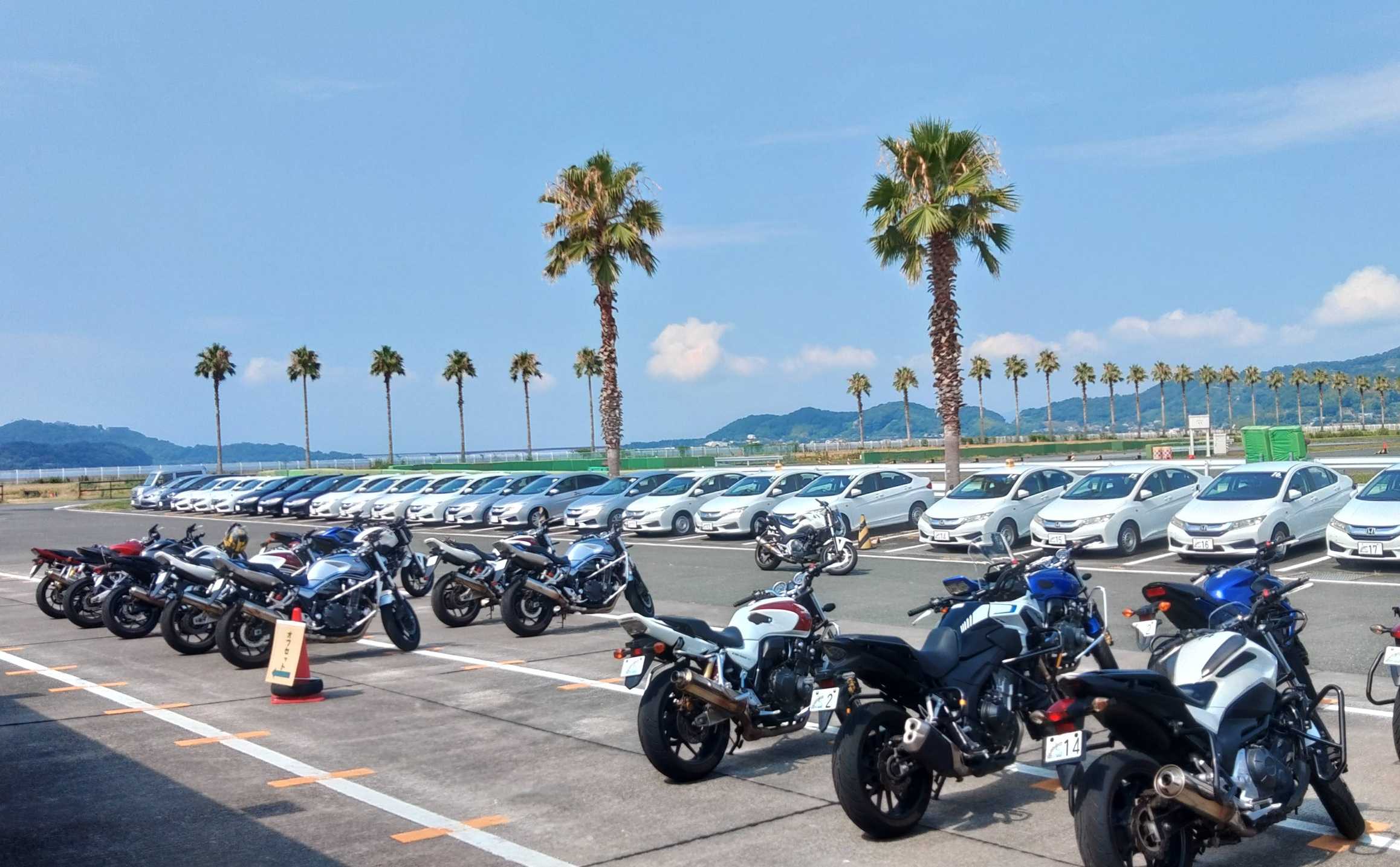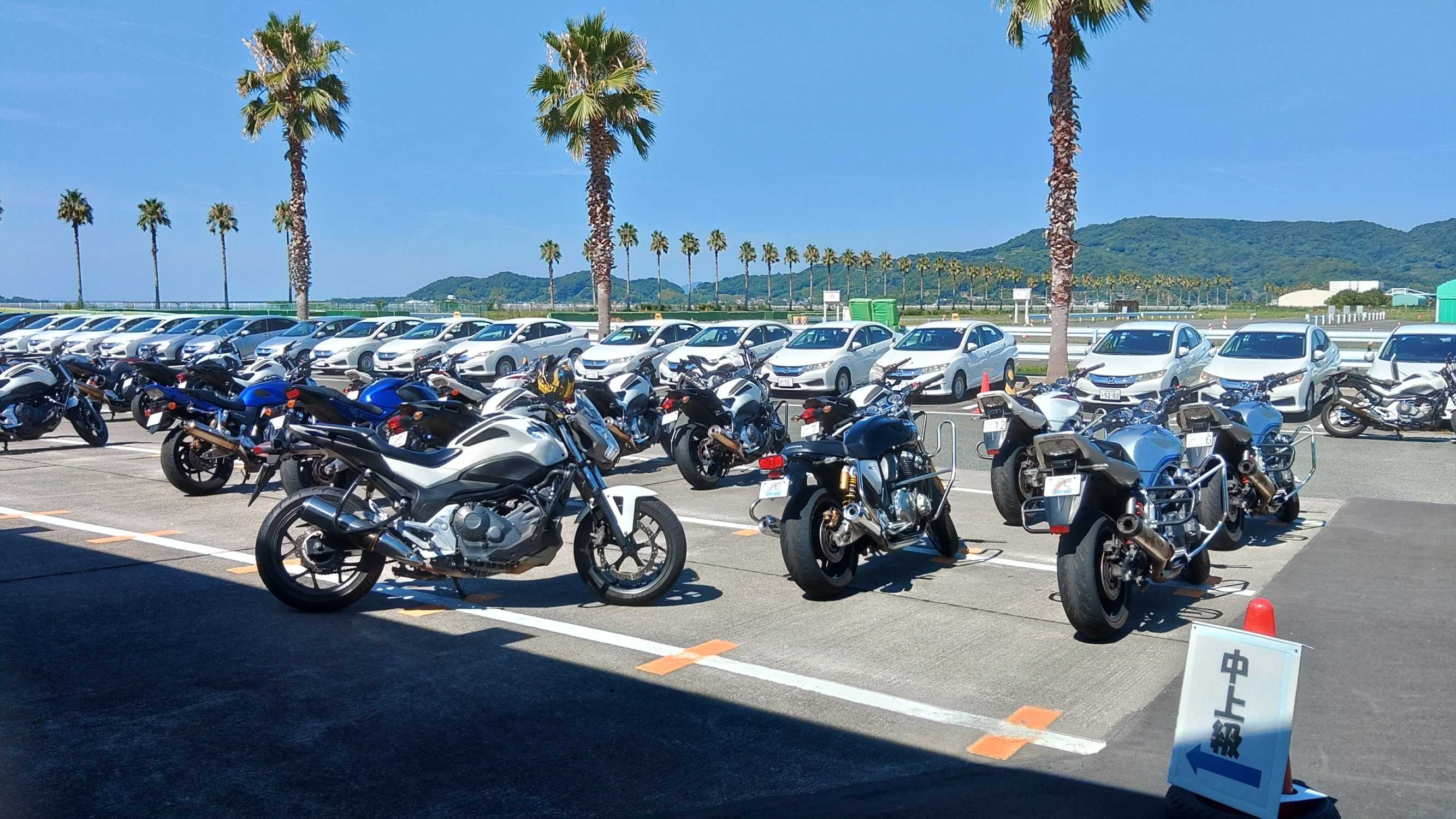 お盆の時期なので渋滞かと思いきや、往復とも渋滞はなくいつも通りに到着しました。参加者は13名、イントラはメインはY木下さん、サブは連勤のK田さん。バイクは650。最初は体が慣れてきたら、外側の腕でパイロンタッチできるようにイン側にしっかり乗る練習です。その次は、アクセルとバンク一定で腋毛が引っ張られる(?)感覚でターンをする練習をして午前中は終了。午後からはコーススラで、アクセルとバンク一定で回る感じを織り込みながら走ります。相変わらず状態が前に行く癖が抜けません。Y木下さんからは、「一旦前に上体が入ってからイン(後ろ気味)に乗るので、タイミングが合わない」と指摘を受けました。K田さんからは、「ターン後半で失速しています。顎を引くように乗っていると前に頭が行ってしまうので、顎を少し突き出すイメージでもいいので、背骨に頭の重みをかけるイメージで」とのこと。最後は細かいオフセットを取り込んだコースで、しっかりハンドルを切る走行をしました。ここでは特にご指導はなかったですが、個人的にはオフロードの細かいオフセットのイメージで、ハンドルと下半身でしっかり回り込んだらアクセルを開ける、加速していく感じで走るといい感じでした。57kmほど走行しました。
