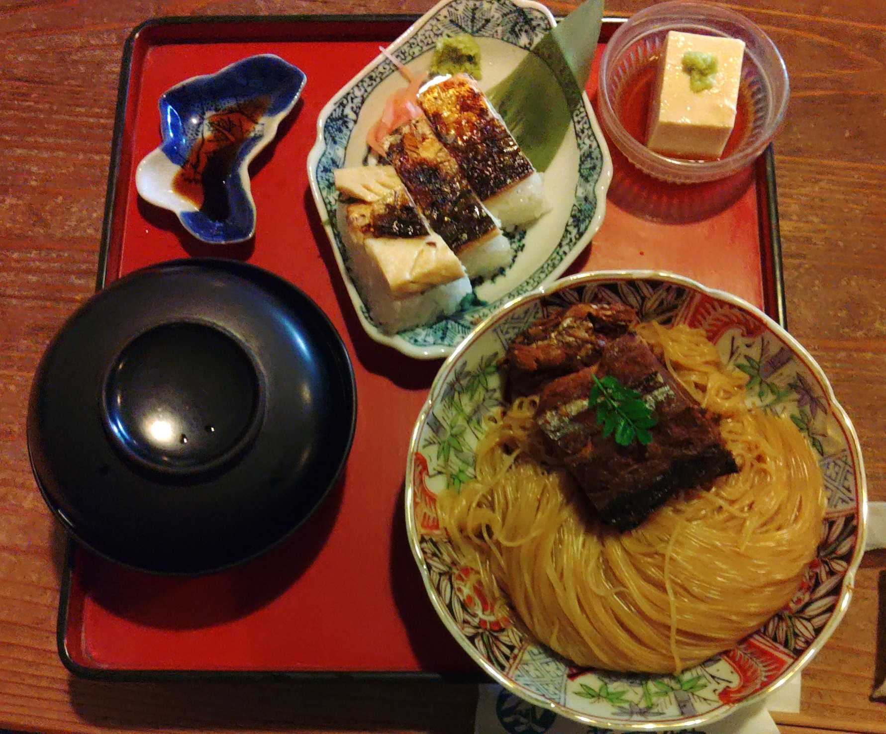 当初は12時ごろに着く予定が、しゅぱつが30分遅くなった分、到着も遅くなり12時40分ごろに駐輪場に到着、他の先に着いていたメンバーが入った「翼果楼」に並んで入り「鯖街道定食」という鯖そうめん+鯖寿司が入った昼食を食べました。