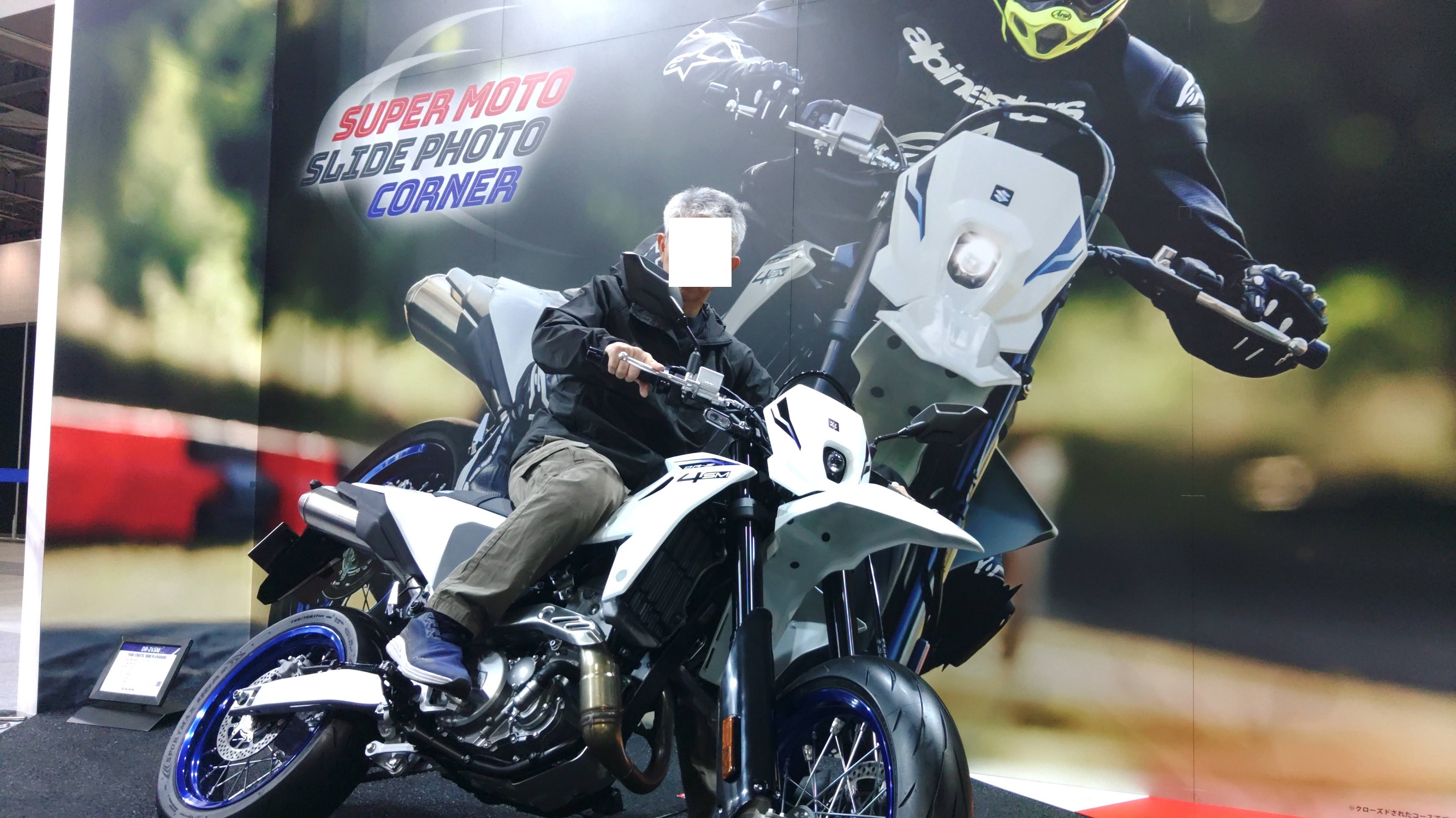 スズキのブースにも寄ってDR-Z4SMの跨り体験(撮影)をします。