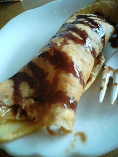 バナナを消費するのに、バナナブレッドやマフィン以外で何かないか・・・と考えて思いついたのがクレープ!これが子供たちにビンゴで二日連続でクレープのおやつとなりました。作り方はとっても簡単。材料はホットケーキミックス50g、卵一個、牛乳3/4カップ、溶かしバター10g、お好みで砂糖(10gくらい)。ボウルに砂糖と卵を入れ泡だて器ですり混ぜる。牛乳とミックス粉を加えてさらに混ぜる。最後に溶かしバターを入れて混ぜれば生地完成。温めたフライパンに薄く油かバターをひき、余分な油をふき取って生地を流し焼く。出来上がったクレープにスライスしたバナナを並べて、チョコミルクをかけてクルクル巻く。さらに上からチョコミルクをかけて・・・私はシンプルにメープルシロップをかけて。参考にしたのはこちらの本。スタイリングがとってもかわいい。【送料無料】かーんたん手作り『ホットケーキミックス』で毎日のおやつ&パン