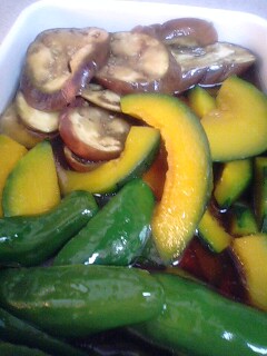 なすびとかぼちゃ、ピーマンを素揚げして出汁に漬けておく揚げ浸し。冷たく冷やしても美味しいし、大根おろしを添えて食べてもでも大阪は暑くて、とてもじゃないけど揚げ物はできませんそんな時はシリコンスチーマーのお世話になりましょう!なすでもかぼちゃでも薄く切ったものをスチーマーに並べて、油をタラーッとまわしかけます。ふたをしてレンジで4・5分チンすればOK。それを天つゆ程度の濃さの出汁にアツアツのうちに漬け込みます。これで揚げ浸し完成!たっぷり作って余ったら冷蔵庫で冷やして、また次の日もどうぞ。なすの色が少し悪いですが気にしない~私は今回はサラダ油ではなく太白ゴマ油を使用。普通のゴマ油と違って独特の風味は全くありません。でもコクがあってさっぱりと仕上がります。太白胡麻油 1650g【製菓用ごま油】シリコンスチーマーはシャルルビアンサンのエスカルゴLサイズ。最近はふたが取り外せる日本仕様のものが出たみたいです。ルクエでもviv(ヴィヴ)でもひとつ持ってると便利です。シリコンスチーマーでヘルシークッキング♪【CHARLES VIANCIN】シャルルビアンサン「シリコンスチーマー Lサイズ」(日本製エスカルゴ、シリコン、料理グッズ)円高還元アイテム!大好評のラッピングは嬉しい無料です♪【楽天ランキング1位 30%off】レクエ(ルクエ)lekue スチームボックス(オレンジ)「無料ラッピング可」【YDKG-td】【期間限定%offセール!!】【ポイント10倍】レビューで送料無料★viv(ヴィヴ) シリコンスチーマー DUE(デュエ) 選べる5カラー♪ レシピ付きスチームケース ルクエに負けない機能でこの価格♪【楽ギフ_包装】【楽ギフ_のし宛書】【smtb-f】★kitchen0810★【SMTB】【MB-KP】【0816_送料無料】