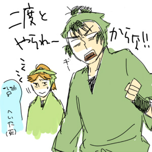お、一昨日の日記・・・やべえええはじけすぎだろ!ぐほあちょっと も ち つ け ! でも昨日今日のも面白かったよ!いや毎日面白いよ!ていうか子安さん出てたあああああ しかもいっぱいしゃべってるようおあそして今日の食満はなんじゃありゃあかわいすぎるZE☆今日もスロー再生して遊んでいたら仙蔵に畳がぶつかったところの顔が(笑) ひでええええそんなこんなでね!夏休みネタなんてやるのかなーと思いながら来週月曜の食満登場を心待ちにしておりますよ!そして富松もでるんだよっほーい結局今日もそれなりにはじけて終わりそうだ。↓はじけた結果後悔はしていない。食満が2人いるのは仕様です。藤内の顔が黄色いのも仕様です。明日から学テなのに何やってんだ自分・・・! でもテスト直前こそ描きたくなるんだよ! そして日記も長くなる・・・あああきりがない! 普段しないゲームもしたしなあ お前ほんとに大丈夫か。いや、大丈夫じゃない!さっきなんか奇怪な虫がうろうろこそこそしてたので思わず条件反射で叩き潰してしまったんですが、アレはなんだったんだ・・・ちゃんと確認しなかったけどGではなかったように思われます。いやぺチャンコで中身まで飛び出してたからなにやら判らなかったけども。ていうかアレは私の部屋に潜んでいたのか・・・?ヒイイイイ決めたよ・・・俺このテストが終わったら、部屋の掃除するんだ・・・!勝負は明日の午前の内職だ!