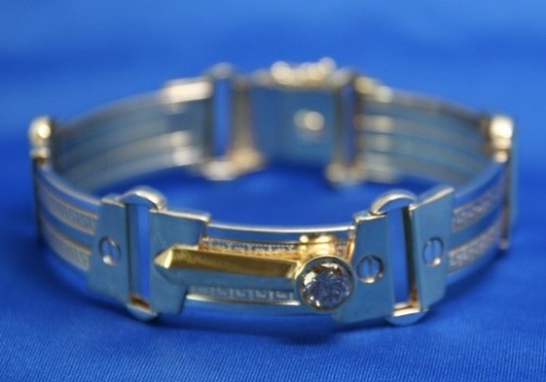 2015年度のジュエリー作品の写真です。降魔の剣バングル(男性用)です。1点ものです。剣の部分:18金イエローゴールド、 コニャック・ダイヤモンド(天然未処理):約1.6ctバングル土台部分:14金ホワイトゴールドと14金イエローゴールドのコンビ(市販のイタリア製ジュエリー。大昔のヴィンテージ品の新品)男性のお客様のオーダーメイド作品です。降魔の剣をバングルで身に着けたいとのご要望でした。キャスティング屋さんに金をキャストしてもらうほうが高くつきますので、私が全部作ると幅は1cmくらいとなり、もっと細めのバングルになるところでした。出来合いの完成品のお得なジュエリーを土台に使って、それを改造して剣を付け加えるほうが、同じご予算でゴージャスに仕上がるので、今回はその方法を選びました☆・・・そのように考えて土台のバングルを探している時に、ちょうど、大昔のヴィンテージのイタリア製の上等なものを見つけて、金無垢ですしカッコいいデザインなので、一目ぼれで即入手しました!幅は2cmくらいあって、がっしりしています。降魔の剣を、このバングルに合うデザインと大きさ、バランスのものを新たに作り直しました。コニャックダイヤモンドは天然で未処理のものなので、貴重です。この写真では分かりづらいですが、実物のダイヤモンドは巨大なので、大迫力です!大迫力の、カッコいい降魔の剣バングルに仕上がりました☆大好評で、ご満足下さいました☆このバングルは、周りで一目見た方々は、女性でも男性でも、「これはカッコいいわ~!これなら欲しいわ~!身に着けたいわ~!」と言っていました。欲しがる方が多かったです。ご贔屓くださり、ありがとうございます☆