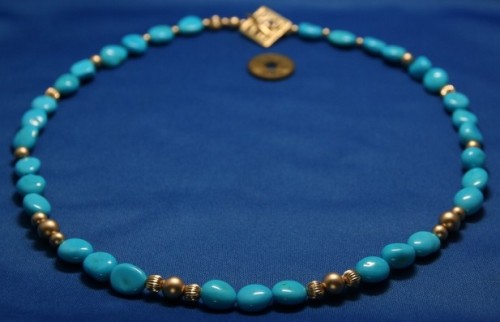 こちらの写真は、オーダーメイドの1点もののネックレスです。デザインと製作は私によるものです。2015年~2016年の作品です。この上等なとっておきの1点ものビーズの連に一目ぼれして、同時にデザインのイメージ、構想がはっきり浮かんできたので、入手しておきました。これは、購入時に、先にデザインがパッと浮かびました。すごく鮮やかな水色のターコイズ、上等なスリーピングビューティーなので、その青を引き立たせるために金色を使って組み合わせたい!と熱望しました。私が最初にイメージしていたもののように出来上がったので、満足しています。スリーピングビューティーの原石ビーズ(サイズ1.5cm以上)、14金フィルドのブラスビーズ(大中小のサイズ)、市販の留め金:シルバー製、14金フィルドステンレスワイヤー(表面はコーティング)、フレンチワイヤーなどを使って組みました。写真では分かりづらいですが、ネックレスの長さはけっこうあります。セーターの上から着けられるくらいの長さです。スリーピングビューティー・ターコイズの大粒の、上等なビーズ、天然無着色の特別な連を持っていたものを、贅沢に1本のネックレスのために使ってお作りしました。1点限りですので、特別感があります。ビーズの大きさ、留め金の大きさの参考のために、留め金の手前に5円玉を置きました。写真のピントを前方に合わせているので、後ろはぼけさせています。スリーピングビューティーとは、アメリカの有名なターコイズ鉱山でしたが数年前に閉山しました。横からこの鉱山を観ると、スリーピングビューティー(眠れる森の美女)が横たわって眠っているように観えるため、現地の地元でそのように呼ばれているそうです。そのため、閉山したところの鉱物の常で、もう現在は新たなスリーピングビューティーは入手困難で、市場に出回っている分だけとなっています。お値段は、どんどん高騰し続けている一方です。私自身も今さらもう新たにスリーピングビューティーを入手できないだろうと思います。(出会い次第ですが。)以前から入手してあった分だけしか無い状態です。この留め金もまた、一目ぼれ(!)で、大きめのシルバー製の14金フィルドのもので、デザインが「アールデコ調」でカッコいいし四角いし、留めやすいからお気に入りです。私はアールデコの時代のデザインも大好きなのです☆☆☆「なにこの留め金~! まるでアールデコそっくりやんか~! 超カッコいい~! しかも自分で作るより安くつく~! 私のために作っておいてくれたみたいだわ!」と思い、即決で、「これ全部下さい!」とありったけの在庫全部を大人買いしておきました。それほど、この留め金のデザインは私好みのものです。もしかして、アールデコ時代の何かを参考にしたものだったのかもしれないな~と思ったほどです。もう製造していないそうです。10年以上前の大昔の在庫だったそうです。(・・・そのため、時々、この留め金を使ったシリーズも登場するかと思います☆)大分前に、ターコイズがお好きなお客様に、このとっておきスリーピングビューティーをお見せしたら、目を奪われて感動なさって、即決なさいました☆大満足いただきました。嬉しいです。以下、お客様からのお便りの一部分を掲載します。「スリーピングビューティー ネックレス届きました!すっごく豪華になりましたね。留め金も、こんなの見た事ないです。オシャレですね。王家の墓から出土した博物館にあるネックレスみたいです。大満足です‼︎」「マットな感じが上品です。ターコイズブルーが鮮やかだから、ギラギラしてなくて良いです。コレ本当かっこいいです‼︎博物館に置いてそうだとみんな思うと思います。昔の人に見習って、お守りにします。」ご贔屓くださいまして、ありがとうございます☆