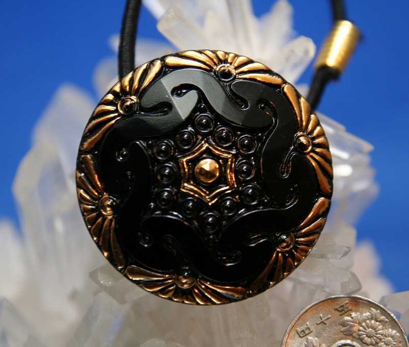 アンティークのジェットガラスのヘアゴムを一般発売のご案内です。これは2年以上前にお客様ご優待販売でご好評いただいた作品です。まだ残りの在庫がございますので、今回、放出します。このご時世なので、減価償却が起こらないヴィンテージからアンティークで、数を確保できているものの企画をお客様ご優待としてコロナ前からご案内して、貴重なものを放出してきました。あるお客様から、「減価償却が起こらないヴィンテージのものが欲しいので、何かおすすめのものがあれば欲しいからご紹介をお願いします」と熱いご要望を度々いただきまして、戦争中ですし通貨も不安定で円安気味なご時世的にそれはもっともだなと思いました。それにお応えするため、お客様ご優待として未使用のヴィンテージの素材の企画を、内輪で少しずつ発表してきました。50年以上100年未満経過したものはヴィンテージ、100年以上経過したものはアンティークで、世の中に品物に限りがあるため、年月が経てば経つほど時価が上がっていきます。一般の人が他に持っていないので、人とかぶらないのも嬉しいですし、この企画は当方のお客様達にいつも大変喜ばれています。お客様達のお役に立てて嬉しいです。近年では、アール・デコ(Art Déco)(1910年代半ばから1930年代)に作られたものもアンティークに分類されています。アール・デコもアンティークなのです。今回のご案内の作品は、そのアール・デコ時代(1930年代より前)に製造された、未使用・アンティーク素材で、旧チェコスロバキアで作られた大きなサイズのジェットガラス(黒ガラス)を使用したヘアゴムです。(旧チェコスロバキアは1918年から1992年まで存在した連邦国家)ジェットガラスを探していた時期に、結局身近な知り合いのジュエリー関連の業者さんのところで、大昔にアメリカへ輸入されたこのジェットガラスの素材を未使用の状態で箱ごと見つけたのです。デッドストックですね。見つけた時は、「あ!これは貴重なご縁を引き寄せた!神の采配だ!弁財天ならではの役割の仕事だ!」と直観しました。輸入された時期が第一次世界大戦(1917年から1918年)の直後で1920年代から1930年代頃だと業者さんからお聞きしました。こんなお宝が、私が見つけるまでは誰にも見向きもされなかったのが不思議です。私から見れば、これは貴重なジェットガラスの歴史のサンプルなので、私にとっては本当に価値があるもので素晴らしいお宝です。捨てる神あれば拾う神あり、ですね。これは弁財天の役割なので、私しか出来ないことです。普通は未使用でこんなにまとまった数が手もとに来るご縁が無いです。お客様に喜んでいただける!という一心で、「これは皆、すごく喜ぶな~!」と嬉しくなりました。この表面の金色のメタリックな輝きは、本物の24金を使用してコーティングされています。ちなみに現在は当時より金価格が高騰したため、もうこのようにガラスに金をコーティングはなかなかされないです。今後も金高騰は続いていきますから、貴重です。アンティークならではの高品質です。(また円高が大幅に進むことがあったり、ダイヤモンドのように金を人工的に合成する技術(錬金術)が発達すれば値下がりするとは思いますが。戦争が起こると金高騰が起こり、歴史的に値上がりし続けていますよね。今後大幅に下がっていくことは無いと思います。)ジェットガラスは1900年代初頭頃から1970年頃までチェコスロバキアで作られていたもので、太陽の光も通さない漆黒の色のガラスで、今では使用されていない薬品を使っています。通常の黒いガラスに比べて黒色の濃度が高いです。ジェットガラスの裏面は、特殊な薬品と製法(細かい粒々を少しずつ溶かして型に流し込んでいたそうです)のため、表面がザラザラしていて独特ですから、真偽を見分けられます。普通の黒ガラスの裏面はツルツルです。このように、本物のチェコスロバキアのジェットガラスは、一つ一つ時間と手間暇をかけた手作りで丁寧に作られたものです。この写真撮影時にも、照明をあててフラッシュをたいてもガラスの表面に光が反射せず、光を吸収していました。本当に真っ黒で、まさに漆黒です。(写真は、サイズ参考のため50円玉を置いています。)現在ではジェットガラスは作ることが出来ないうえ製法が途絶えたので、世の中に出回っているものだけですので、入手困難で貴重なアンティークです。イギリスで18世紀ビクトリア時代に、イギリスで流行したビクトリアン・ジェット・ジュエリーのジェット(黒い木の化石)の素材が手に入りにくかったため、19世紀後半からそれを模してガラスで有名なチェコのボヘミア地方でジェットガラスが開発されていき、作られていました。このアンティーク素材の型はその後も使用されて現地でガラス製品は製作されていたようですが、型は残っていても、この漆黒のジェットガラスはもう今は製作不可能ですので、黒はなかなか手に入らないです。(現在