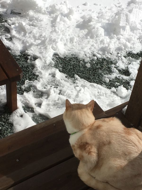 こんにちは🐱 雪、降りました(T ^ T) ユーカリ、ラベンダーが重たい雪でマズイ状態… 雪かきに外に出たのですが、雨まじり、みぞれになってきていたので玄関周りだけやって止めました。 今は雨に変わりました。 雪、溶けてくれないと、夕方から冷えたら明日はアイスバーン怖いっ!>_< ルナ:お兄ちゃん、外、白いね〜 ムーン:出たら面白いにゃ〜 鵄杏:絶対に出しません!