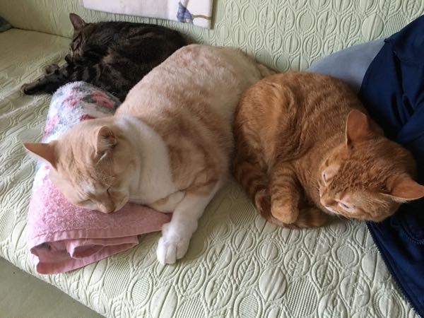 おはようございます( ´∀`) みなさんの所は台風の影響はどうですか? 我が家は只今、暴風の真っ只中のようで 家が揺れて色んな軋む音にびびっている所です。 庭のユーカリの木、大丈夫かなと… 昨日、台風対策で片付けて飛ばないようにしたつもりでしたが、飛び去ってはいませんが倒れたりしている鉢植え達。 様子を見たいですが玄関のドアも怖すぎて開けられません! いつもうるさい末っ子坊っちゃんも大人しいほど。 って、3にゃんみんな静か! 台風抜けて、天気が回復している所も台風通過中の所も、本日は充分に気をつけて過ごして下さいね。 私も3にゃんと静かに家にこもっていようと思います! みなさん、安全第一です! そうだにゃ。