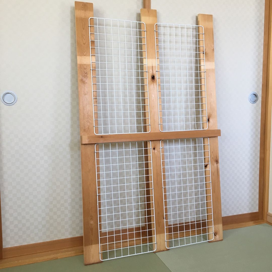 仮設にいた時に棚を組んでいた板と角材を取ってあったのでそれと100均のネットを使って。