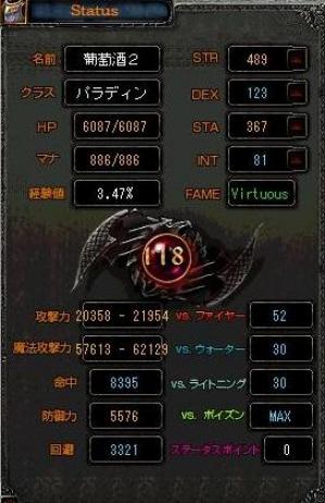 今回の2,3倍イベントで滑り込みセーフ葡萄酒2がLv118に!ドラコも一緒にLv50です^^こんな感じになり、バージョンUP後の火力ダウンもこれで元通りかな? ただしこの数値は、課金フルスクでの支援無しのものです。☆ミニイベントの開催日時と詳細・10月3日(金)・4日(土)・5日(日)いずれかで決行!・各チームの都合により日時を決定して下さい。・3チーム参加、1チーム2PT(12名)で挑戦してもらいます。・各チームに幹事さん2名を置きます。・参加希望者は各幹事さんのブログにメインキャラ名、参加キャラ名(職種と Lv)を書き込みして返答をお待ち下さい。 ・エクワールド 白魔童さん http://plaza.rakuten.co.jp/shiromadou/diary/200809240001/ えむてぃ☆さん http://plaza.rakuten.co.jp/emuthi/diary/200809240000/ ・ラピワールド なりっち♪さん http://plaza.rakuten.co.jp/ynamo817/diary/200809230000/ ぱんとぅるさん http://plaza.rakuten.co.jp/deputy/diary/200809090000/ ・コエワールド又は1チーム 未定 早急に決めます・参加者が多い場合は、選定させてもらいますので参加出来ない場合がございま すので予めご了承下さい。・参加は未転生・転生自由です。・課金スクは自由で。・場所は血の祭壇内(制限Lv70↓)・血の祭壇内にヘイゲル66匹+シュレ34匹を召喚、それらを殲滅後クエ開始~終 了までのタイムトライアル(時間制限無し)です。 ・生成所のジャキエル狩りでの雑魚密集の状況、武器・装備の充実が必要・今回のイベント時での、武器・装備の貸し借り等いかなる問題が発生しても 当主催者は一切責任を持ちません、予めご了承下さい。 出来れば自前の武器・装備での参加をお願いします。・終了時間の早い順に優勝・2位・3位を決めます。・タイム計測は葡萄酒2と各チーム幹事役(PT参加内)が計測します。・景品は下記参照 未使用成長8本 図書館制覇1セット(ソキ冠も有り) KPP×3個、QPP×3個、ルネR×2個、プルR×2個 大魔王冠(ソキ冠は別) ・参加賞 参加者全員に兵書水1枚と忘却1個進呈以上が今回のミニイベントの詳細です☆今後開催までの間、幹事さんと協議して日時・メンバー選定・種々の問題・ 景品の分配等、決定事項・変更が有ればその都度、当ブログにて更新してい きます。