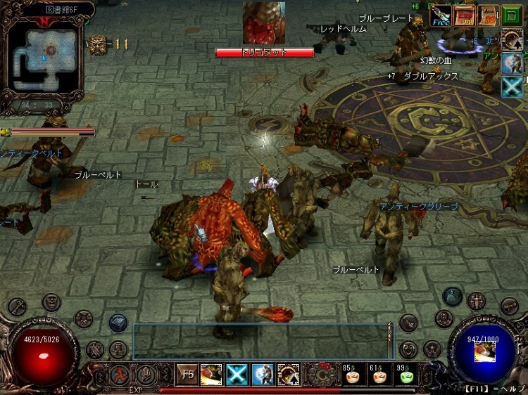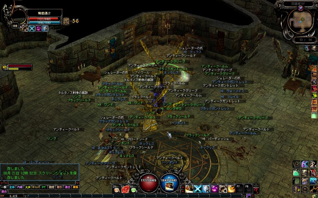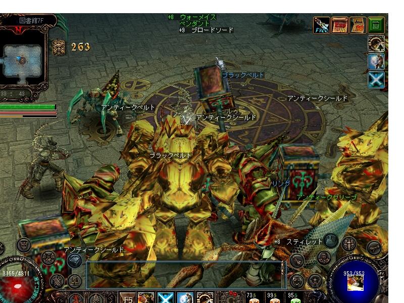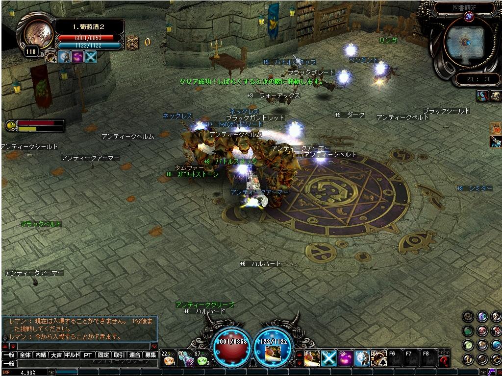 最近クロノスやってて、欲しいアイテムの順位は 1、フレイヤの髪飾り 2、里冠 3、紅蓮の大鎌 4、???こんな感じですかね・・・?やっと出来たコエリスの器を少しだけ共同倉庫で眠らせてから意を決して開ける事にしました。その結果は・・・・・・・・? ↓ 4・・・? ↓ 3・・・? ↓ 2・・・? ↓ 1・・・?来ました1、が><;しばらく放心状態でした^^;でも補正だけはチェックw準MAX補正でしたw思え起こせば里冠イベントで、里冠1個ゲットしたのに喜ぶ間もなく回収されてからどれくらい経ったのでしょうか?実に長かったです><;今日は、ほとんど狩りになってませんでした^^;それでも日課の図書館はと思い、1鯖、3鯖、6鯖と休憩しながら回って見ましたが・・・^^;ラピではよく拾った鯖は3鯖と5鯖が多かった様に思いますので、最後に5鯖へ・・・。2F・3F・4Fとゴミが多くてよく見えません^^;ところが4F中央の大丸のところに・・・・?そうです^^落ちてましたwルゥが・・・ハッ! ドキッ!!・・・エク 5鯖 図書館 4F ルゥ非常に見づらいです^^;ルゥはwしかも何で中央大丸の中なの?^^;なお更見づらいw^^;いつものアイテム欄も昨日・今日で、俗に言うお盆と正月が一緒に来たような感じでしたw^^